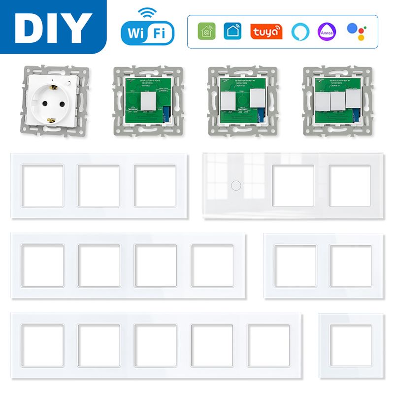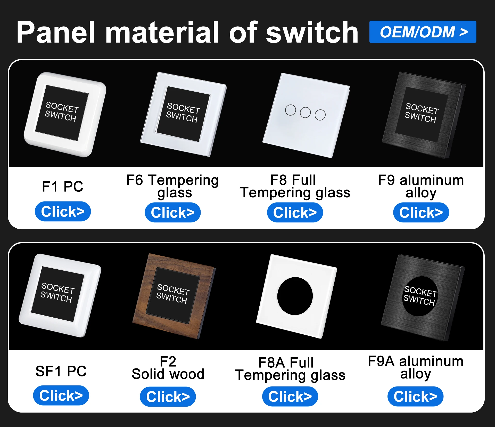 7、Series Module Features:Touch siwtch,Wifi switch,Wifi Socket,LED switch,1/2/3 gang 1/2 way switch,Doorbell Momentary reset switch,Rolling shutter door switch,SOS switch,Ding-dong,TV,TEl,Rj45 Cat5,CAT6,CAT6E,Sat,HDMI,Audio socket,Eu Socket,French Socket,Italy and Europe socket,UK 3pin socket,Universal 3pin socket,Usb socket 2A/A+C/2C 10W/15W/20W,Sound and light control socket,Fan/Dimming/Tuning switch,Plug-in card to take power,human body induction,foot light switch,Touch delay switch,Blank plate,Wiring hole ,Razor socket and So on