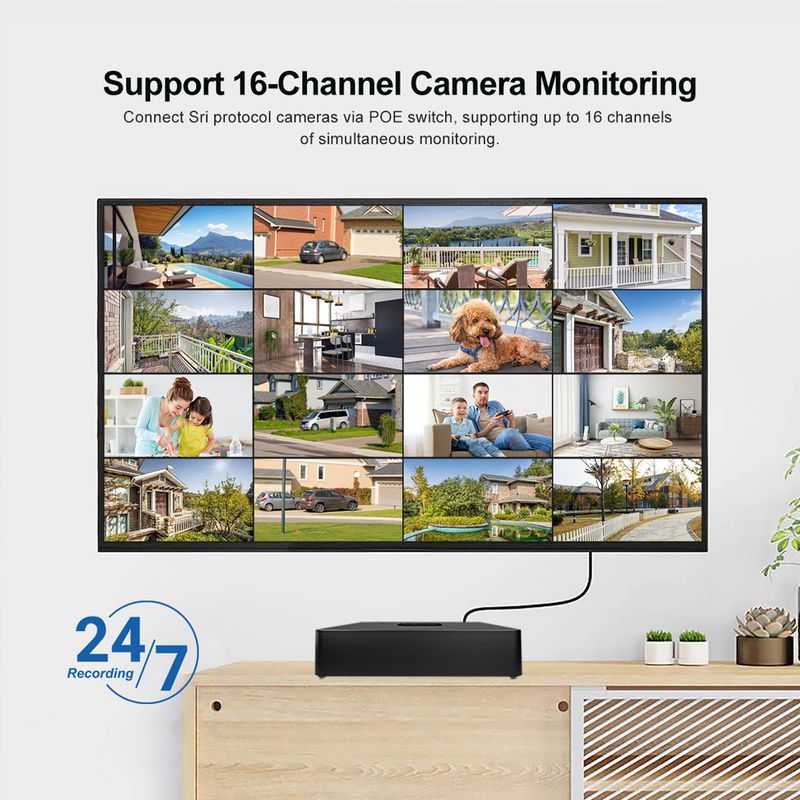 Connect Sri protocol cameras via POE switch, supporting up to 16 channels of simultaneous monitoring.