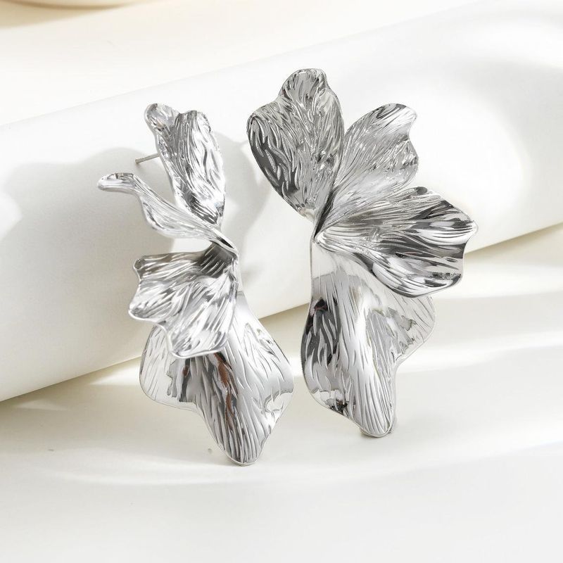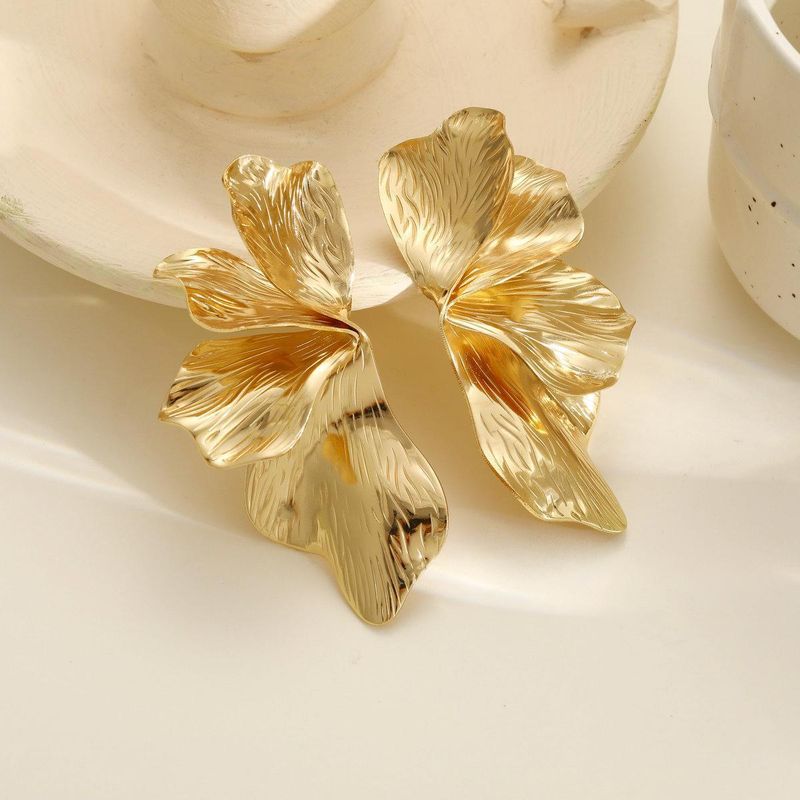 Stainless Steel Golden Double Layered Five Petal Flower Earring for Women Vintage Stripe Flower Dangle Earrings Jewelry Gifts