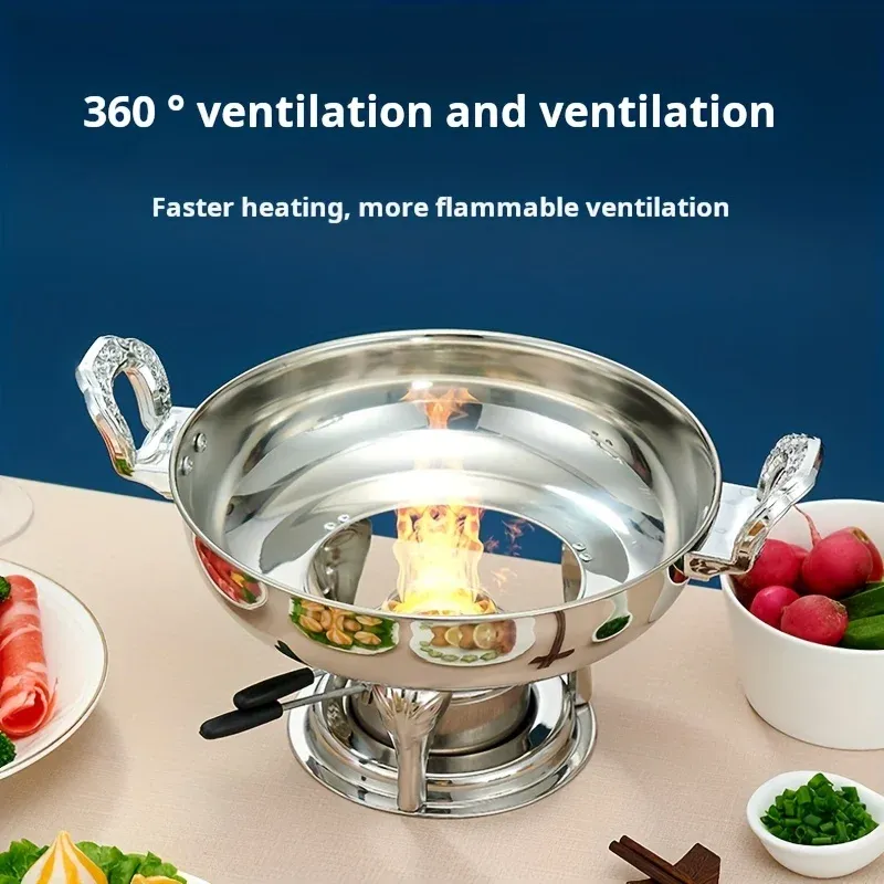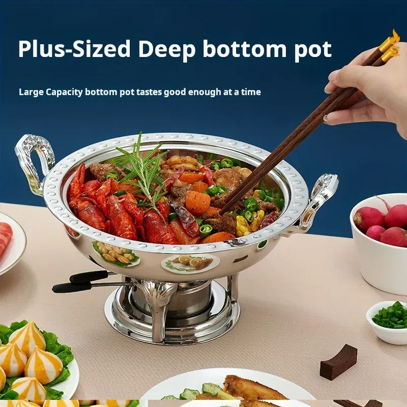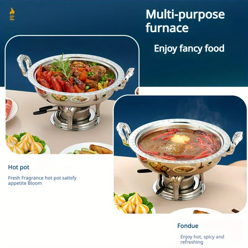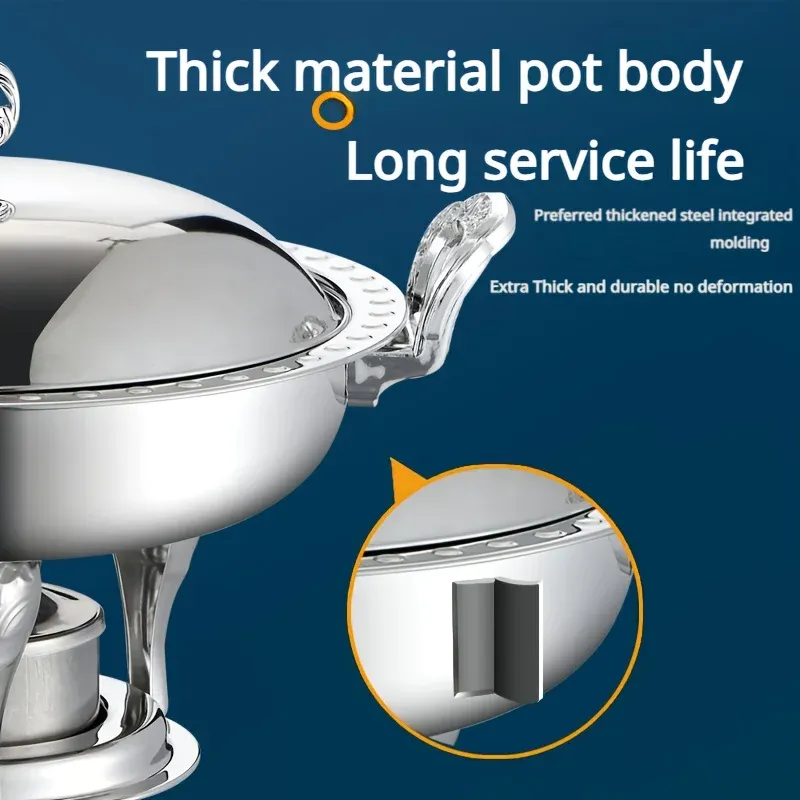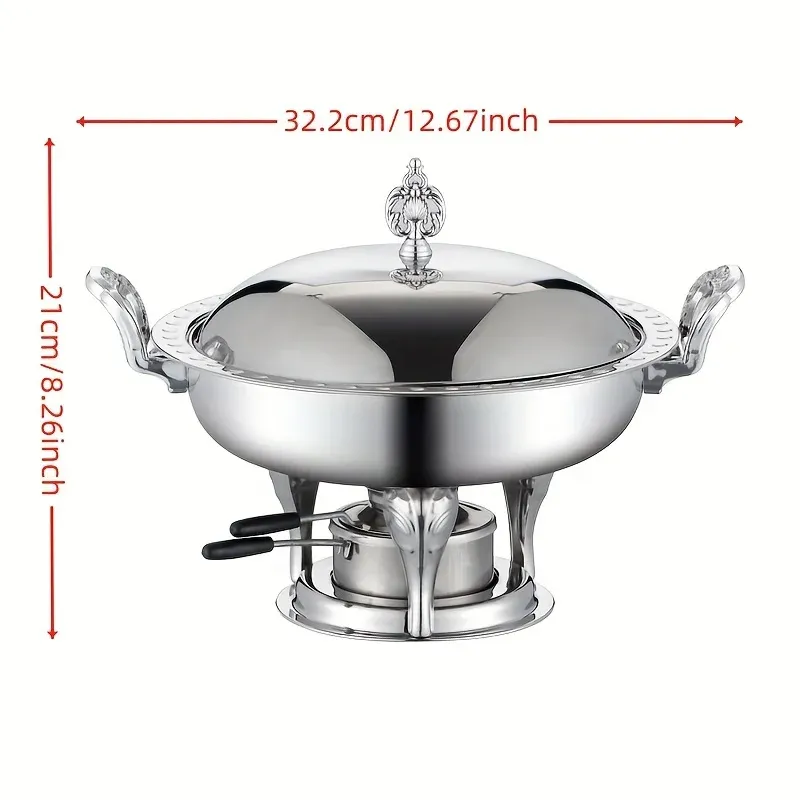 Stainless steel round buffet plate with food tray, lid, wax pot heater, thickened pot body double-ear elephant Zunding solid alc