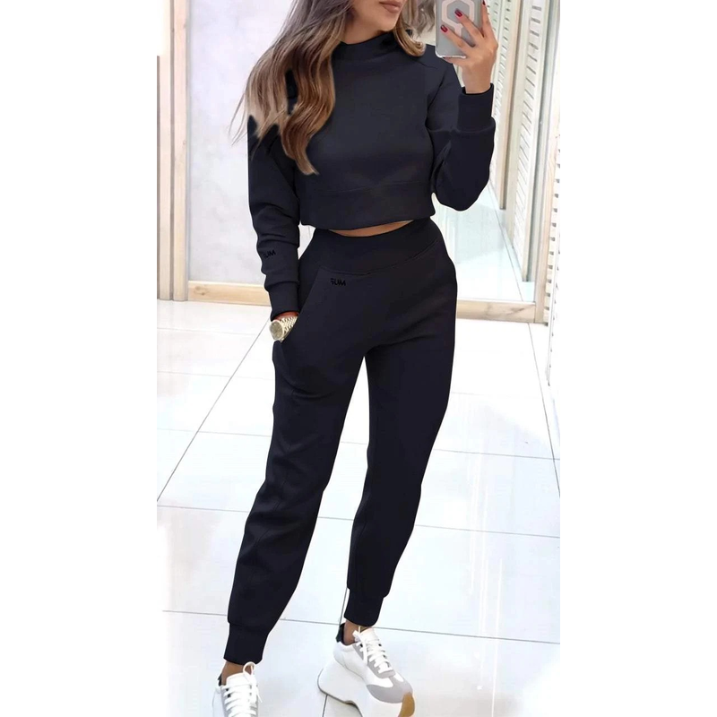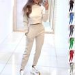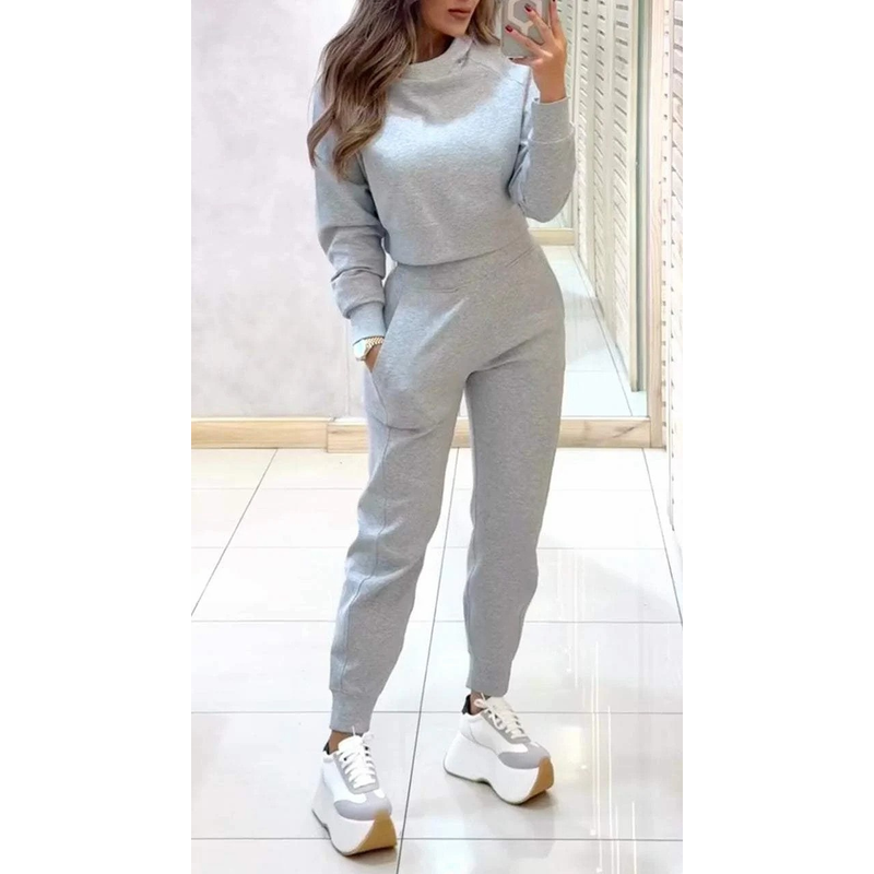 Stand Collar Sports Suit Fashion Pullover Long-sleeves Short Top And Slim Trousers With Pockets Solid Outfits Women's Clothing Light Grey XXL