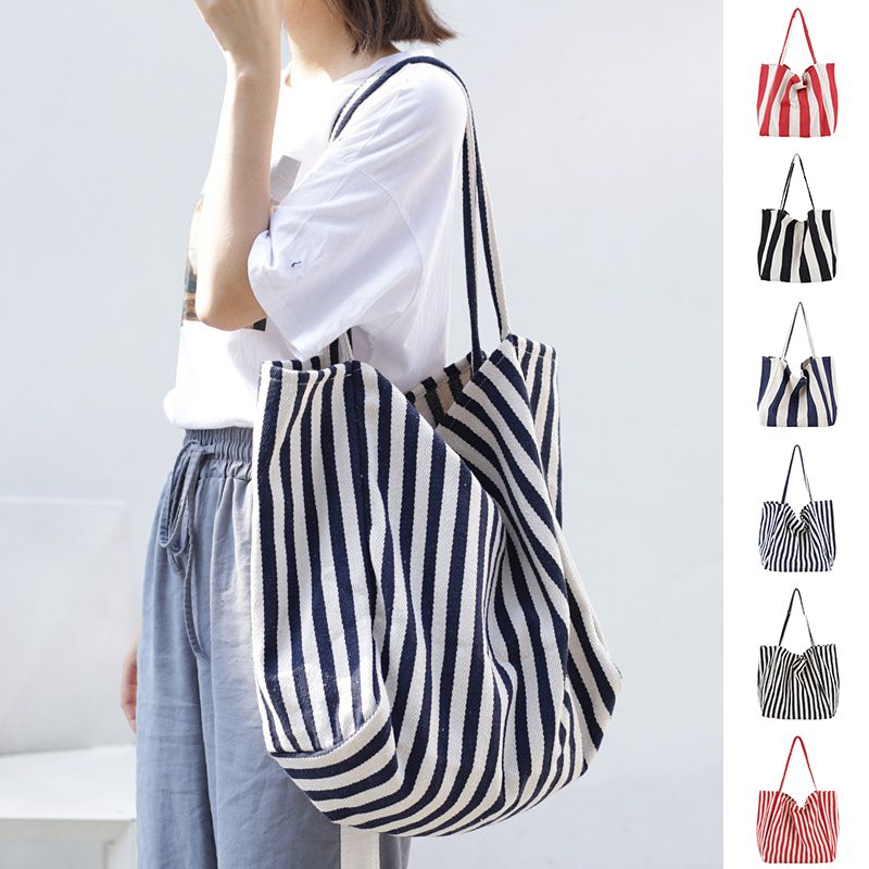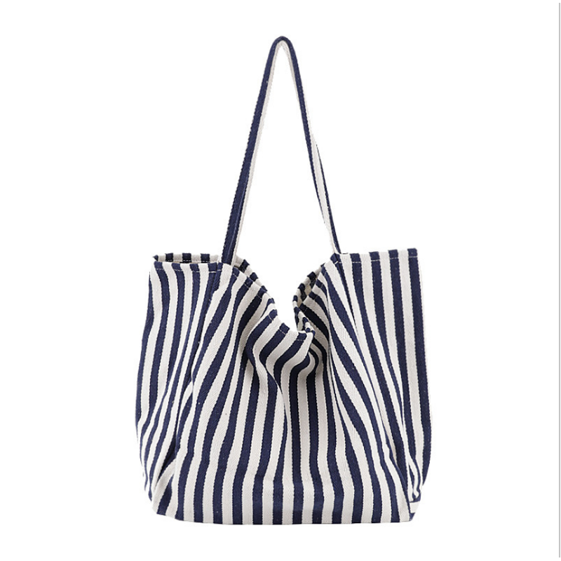 Striped Canvas Bags High Capacity Shoulder Bags For Women Fashion Shopper Handbags Casual Shopping Totes Fine Blue