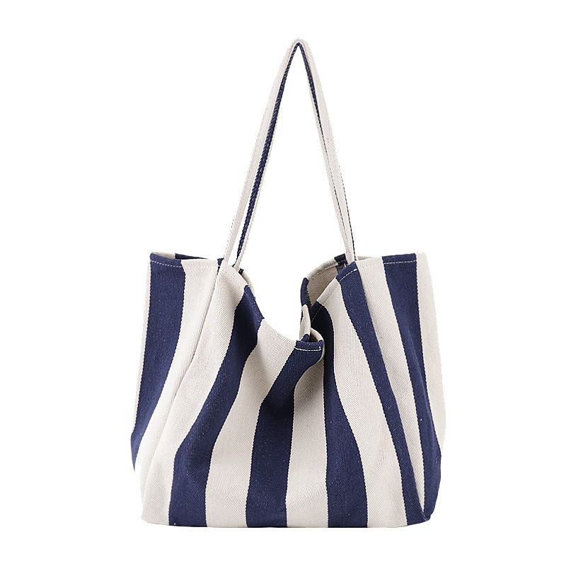 Striped Canvas Bags High Capacity Shoulder Bags For Women Fashion Shopper Handbags Casual Shopping Totes Wide Stripe Blue