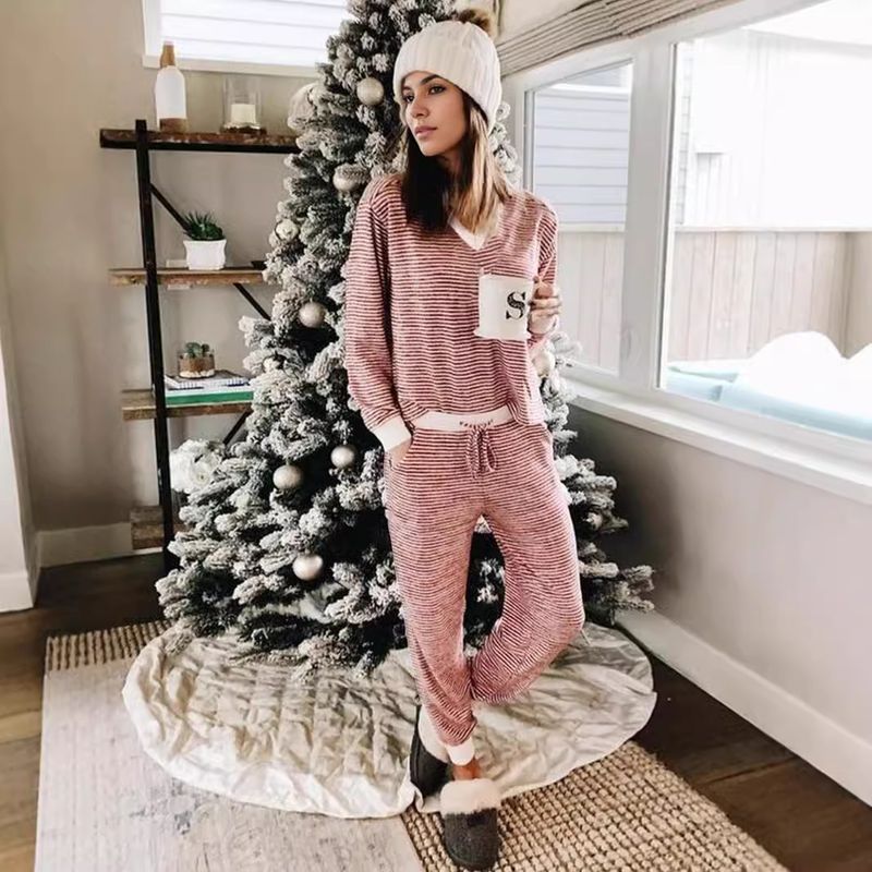 Striped Color Contrast Patchwork V-neck Long Sleeve Trousers Suit Light Gray S