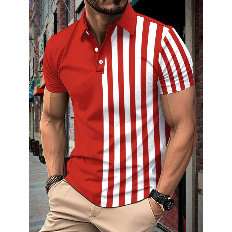 Striped Printing Lapel Polo Shirt Men Red XXL