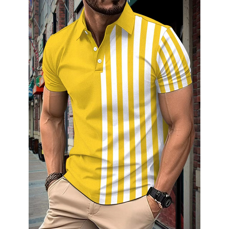 Striped Printing Lapel Polo Shirt Men Yellow M