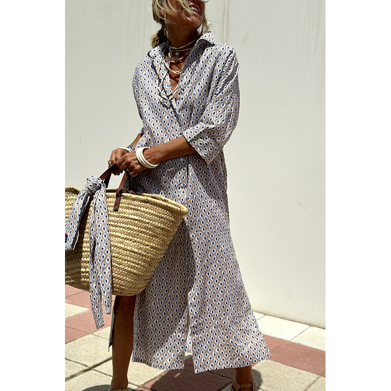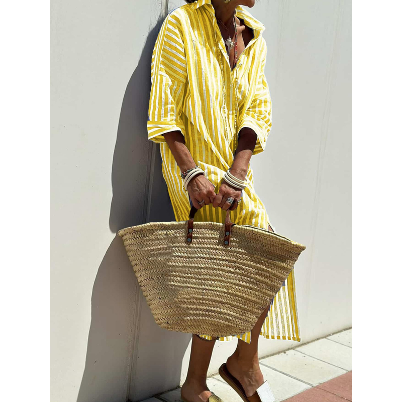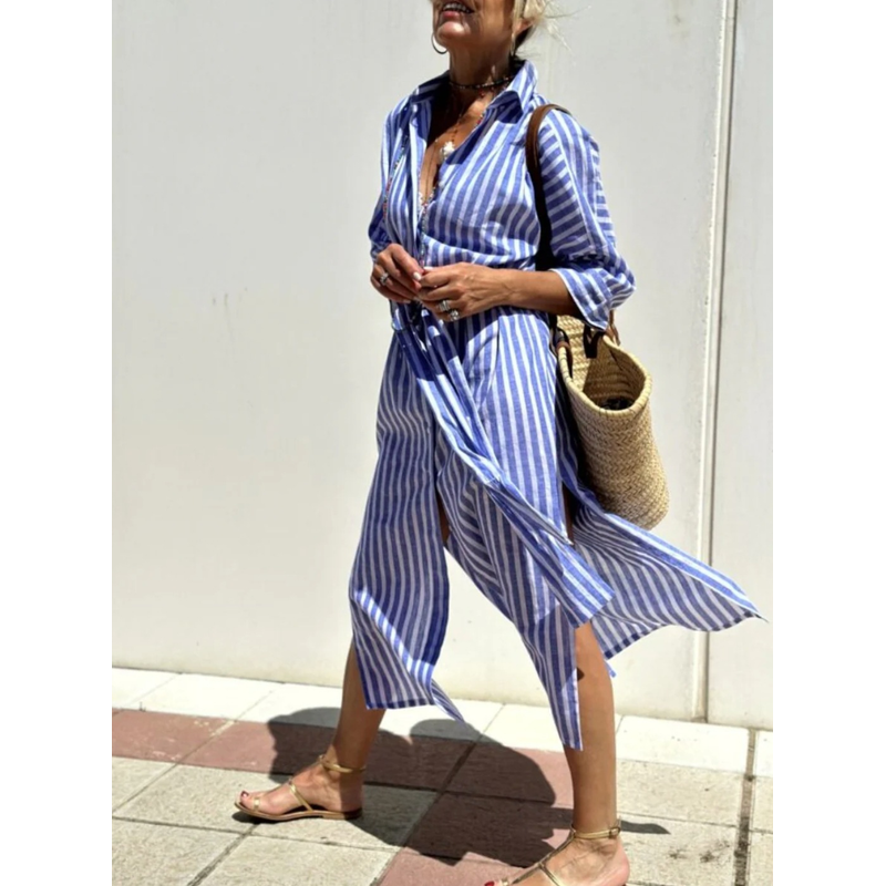 Striped Shirt Dress With Belt Fashion Half-sleeved Lapel Button Cardigan Dresses Women's Clothing Blue XS