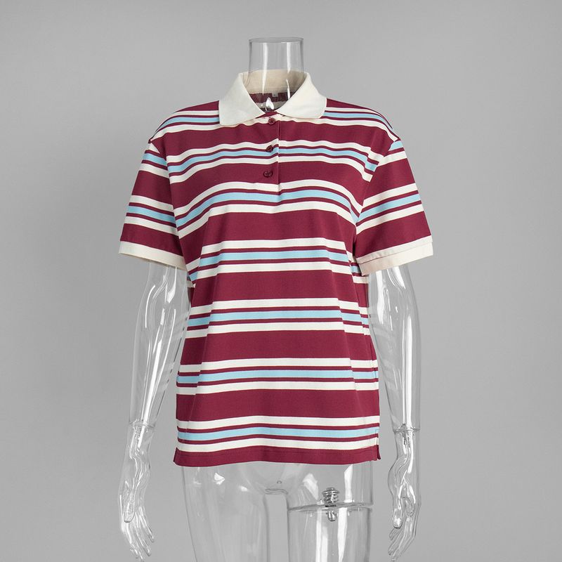 Striped Short-sleeved T-shirt Retro Contrast Color Polo Shirt Wine Red L