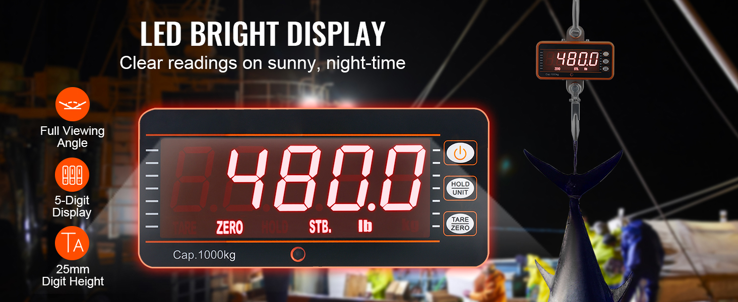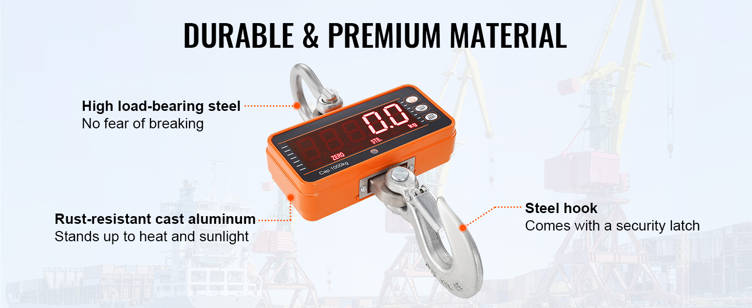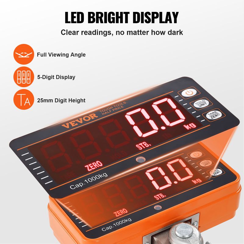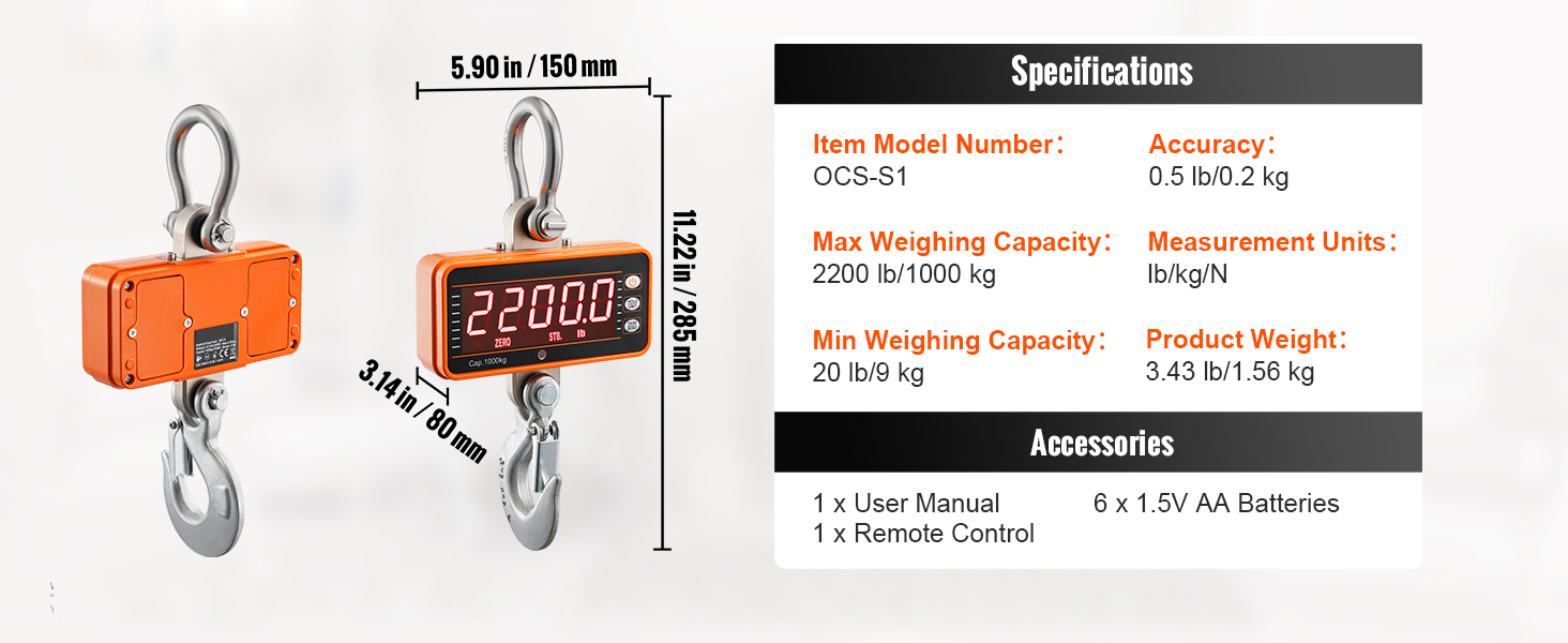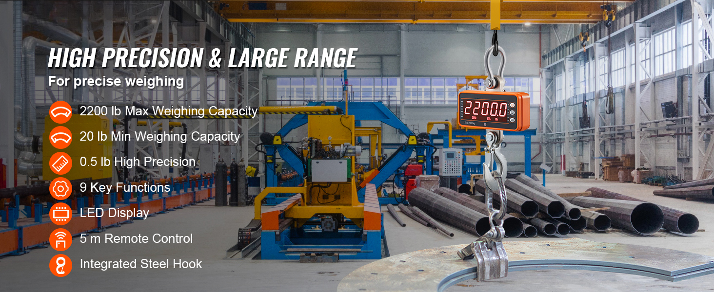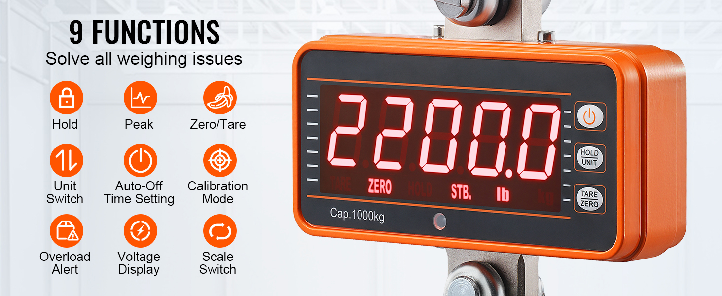 Reliable Precision for Every Use: Measure with confidence from 20 lb (9 kg) up to 2200 lb (1000 kg) with just a 0.5 lb margin of error. This crane scale delivers trustworthy accuracy, making it an ideal choice for your most exacting weighing needs.