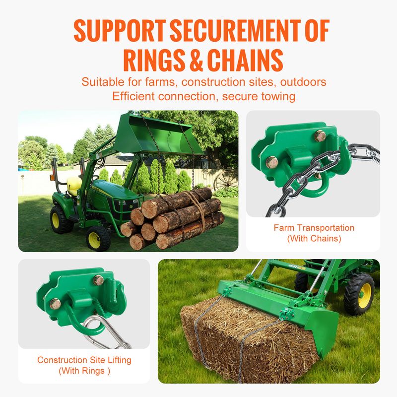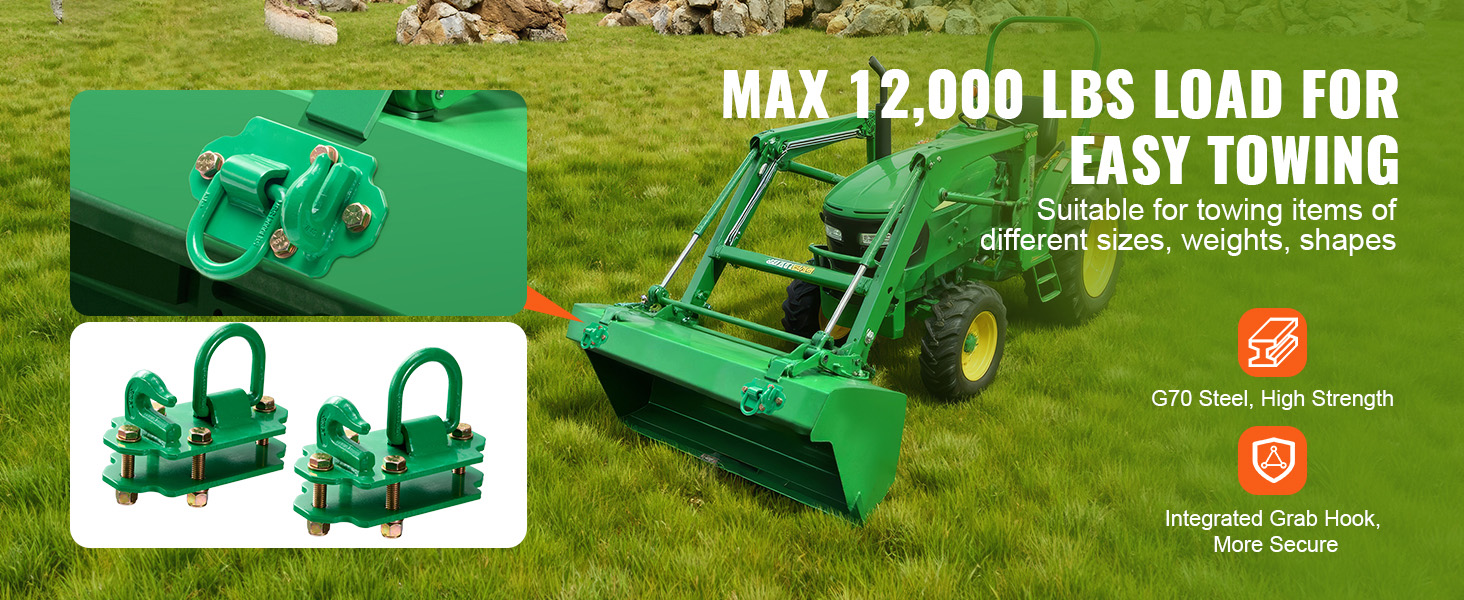 Sturdy Build: The tractor bucket hooks are made with a combination of bolts and welding for a dual fastening system. They have a green powder-coated surface that resists rust and corrosion, ensuring durability even in harsh weather.