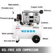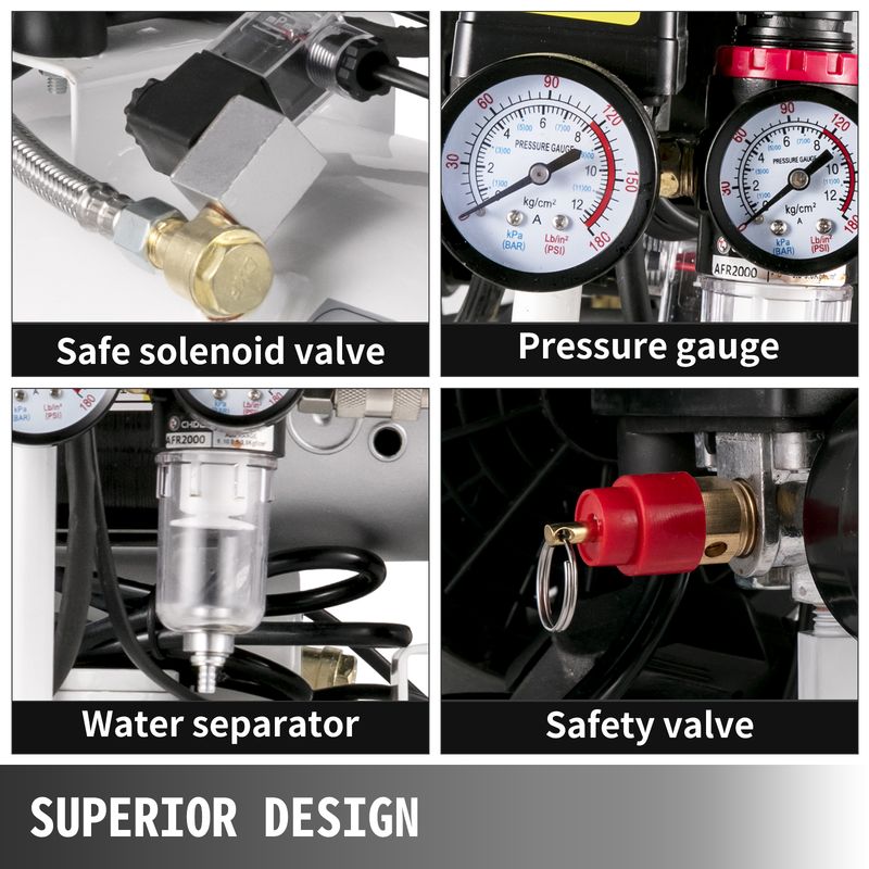 Enhanced Security Features: Includes a solenoid valve for power-off security, a pressure gauge for monitoring tank air pressure, a water separator for filtering air moisture, and a safety valve to maintain optimal tank pressure. Also features heat dissipation vents to prevent overheating.