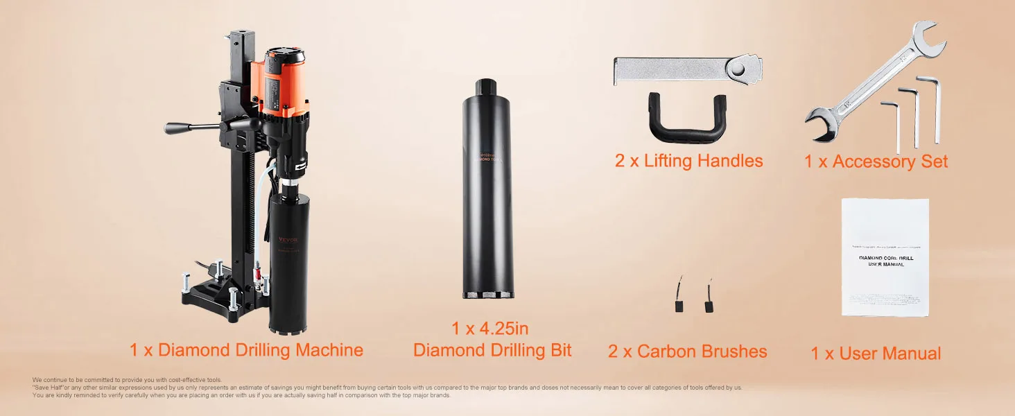 1 x Diamond Drilling Machine 1 x User Manual 1 x 4.25in Diamond Drilling Bit 1 x Accessory Set 2 x Carbon Brushes 2 x Lifting Handles 1 x Lifting Rod