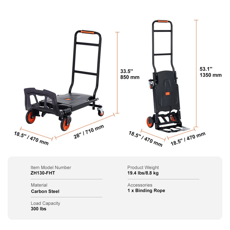• High Load Capacity: Ready for some heavy lifting? Meet your new best friend. With a hearty weight range of 250 to 400 pounds, this hand truck won't break a sweat for hauling, carrying, or transporting. Platform Truck Mode Size: 15.1"L x 42.3"W x 34.1"H; Hand Truck Mode Size: 15.1"L x 15.8"W x 42.3"H.