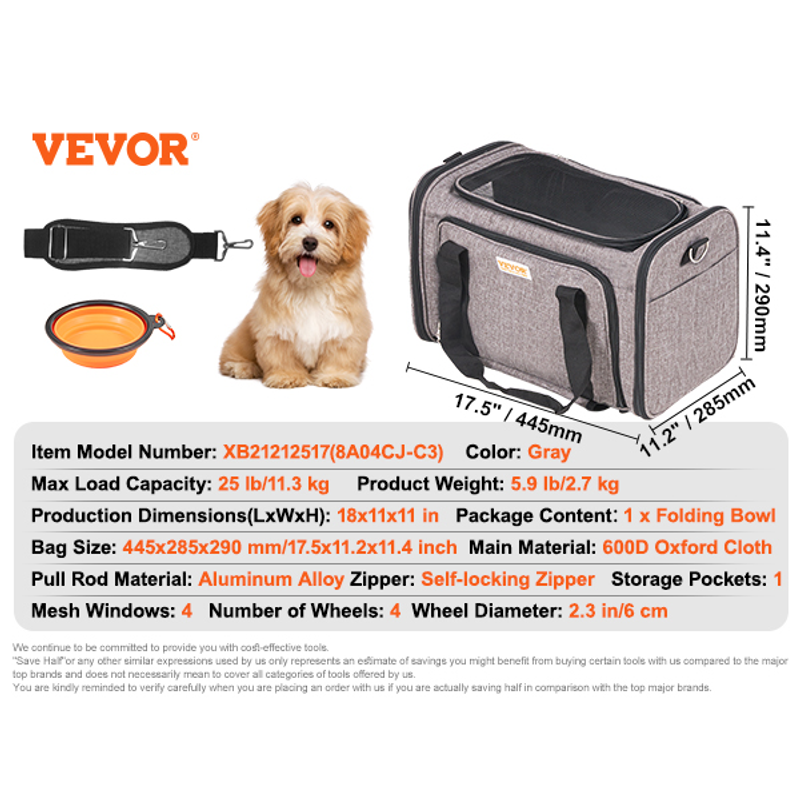• Crafted to comply with TSA regulations, this rolling pet carrier fits under most airline seats, making air travel with your pet easy. The carrier measures 17.5x11.2x11.4 inches (445x285x290 mm) and is suitable for pets up to 25 lbs. Please confirm with your airline before departure.