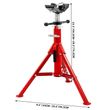 The jack stand can be adjusted from 28" to 52" (71 cm to 131 cm) in height, accommodating pipes from 1/8" to 12" (0.32 cm to 30.48 cm) with its versatile V-head.