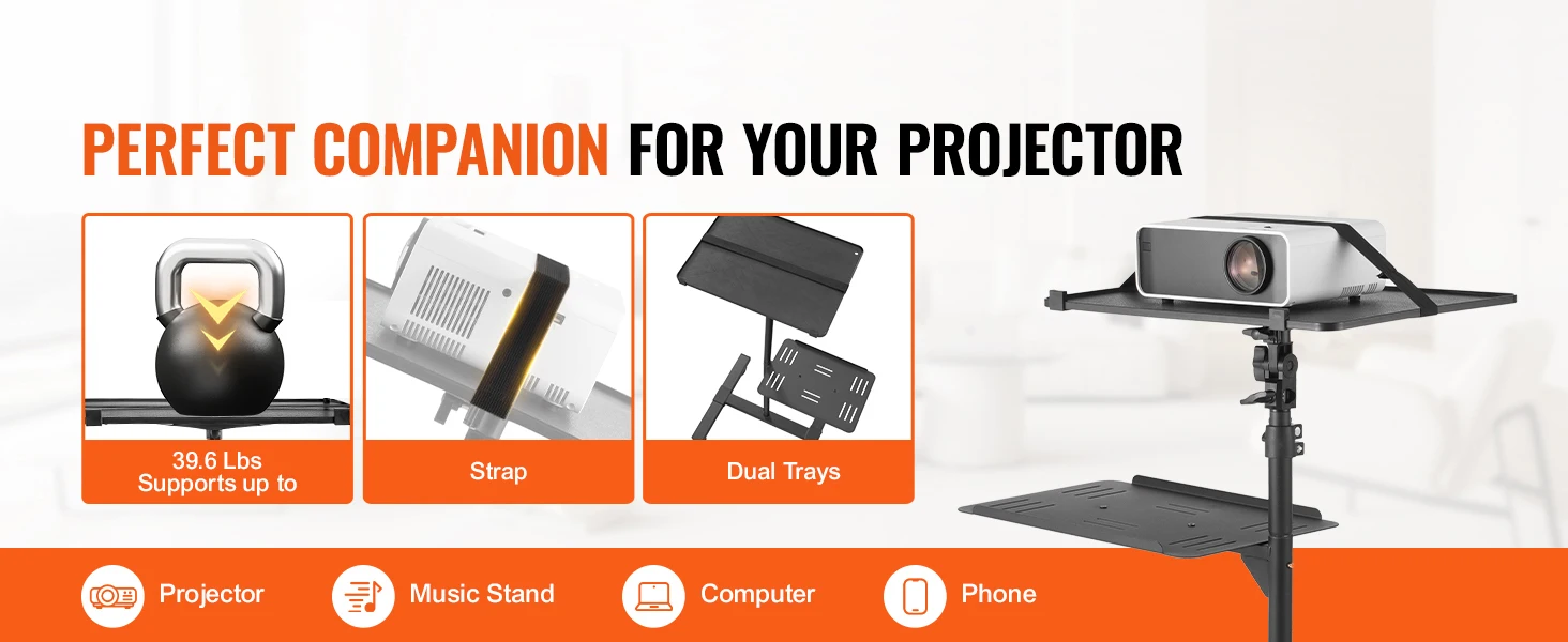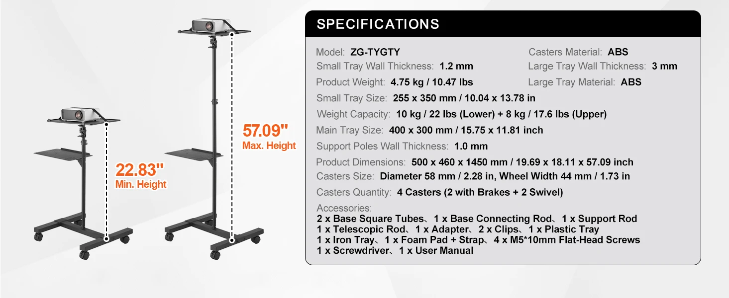 • Stable Weight Support: Built with an iron rod and I-shaped base, this stand for projector includes a thick ABS large tray (11.02 lbs / 5 kg) and a carbon steel small tray (11.02 lbs / 5 kg). The stable structure minimizes shake and tilt, ensuring clear and steady projection in any setting
