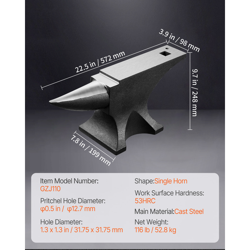• Item Model Number: GZJ24 Main Material: Cast Steel Shape: Single Horn Pritchel Hole Diameter: φ0.3 in / φ8 mm Hole Diameter: 0.6 x 0.6 in / 15 x 15 mm Net Weight: 25 lb / 11.5 kg/li>