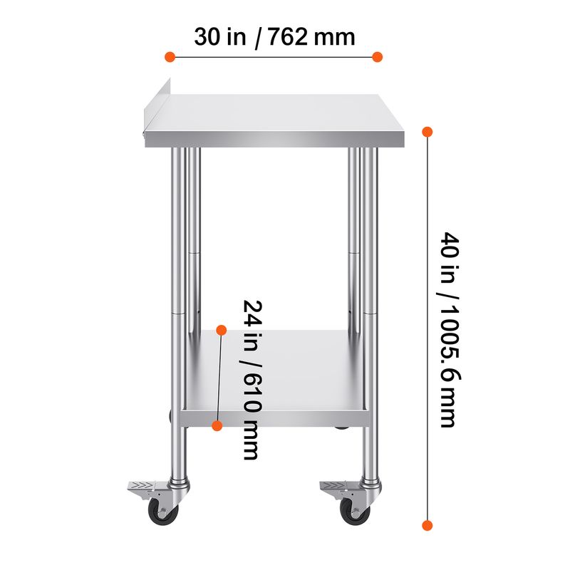 • User-Friendly Design: Featuring 3-level adjustable shelves, this work table offers the most user-friendly and practical functionality. Simply adjust the shelf height with screws to accommodate items of different sizes. Equipped with 4 swivel casters, including 2 with brakes, the table remains stable and can be easily moved to any location. The high rear backsplash prevents items from falling off and guards against water splashes.