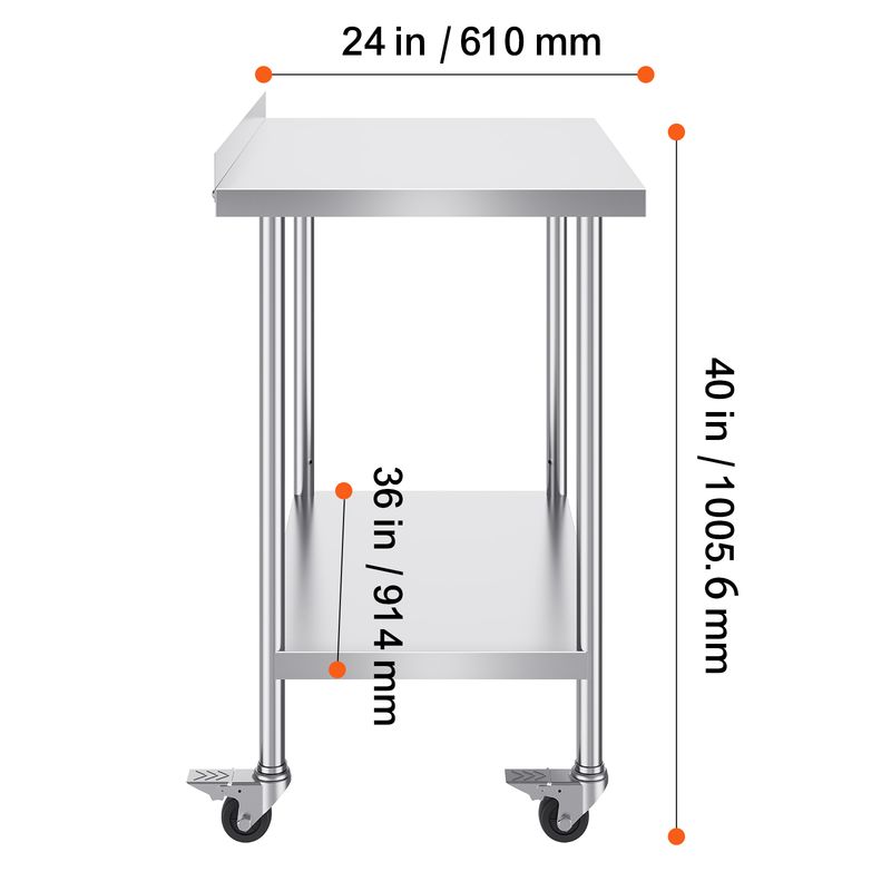 • User-Friendly Design: Featuring 3-level adjustable shelves, this work table offers the most user-friendly and practical functionality. Simply adjust the shelf height with screws to accommodate items of different sizes. Equipped with 4 swivel casters, including 2 with brakes, the table remains stable and can be easily moved to any location. The high rear backsplash prevents items from falling off and guards against water splashes.