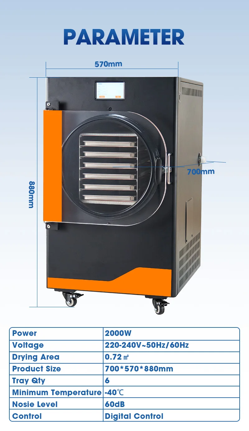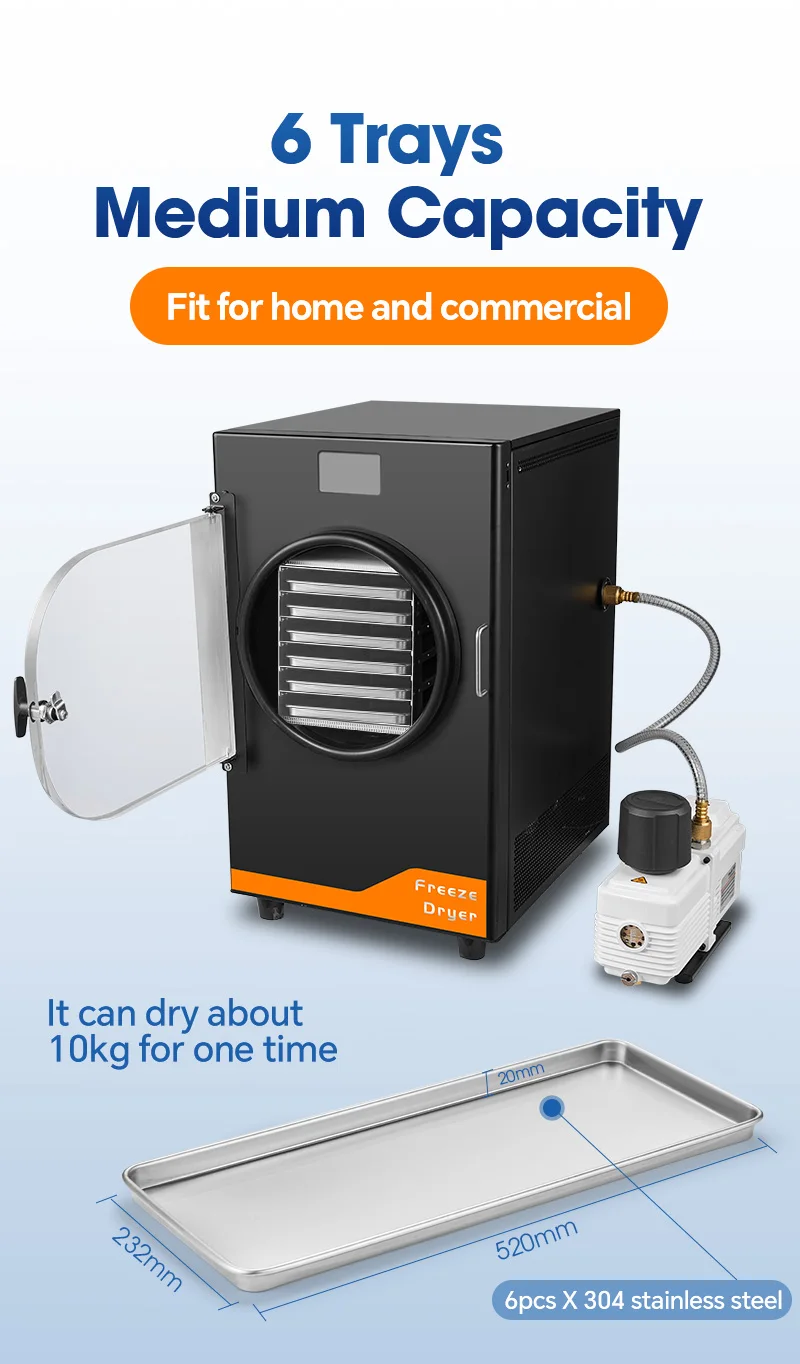 Tray Size:232*520*20mm Tray Qty:6pcs Capacity:10Kg Power:2000W Product Size:550*680*880mm Net Weight:90Kg Package Size:780*680*1300mm Gross Weight:130Kg |
