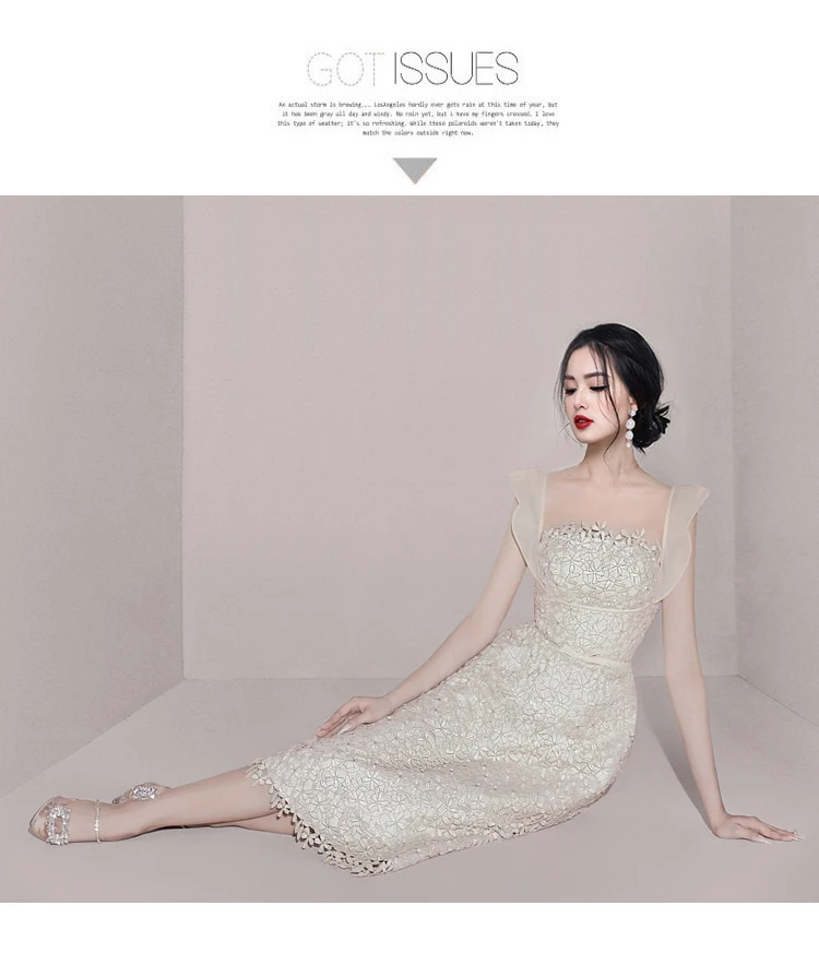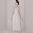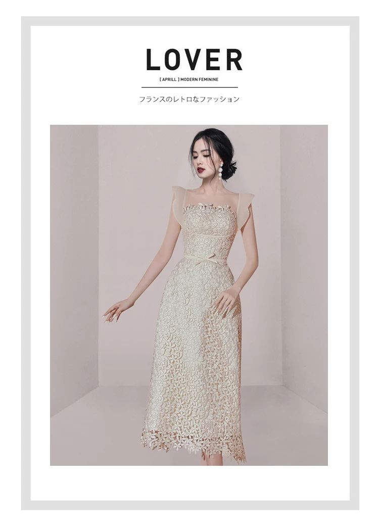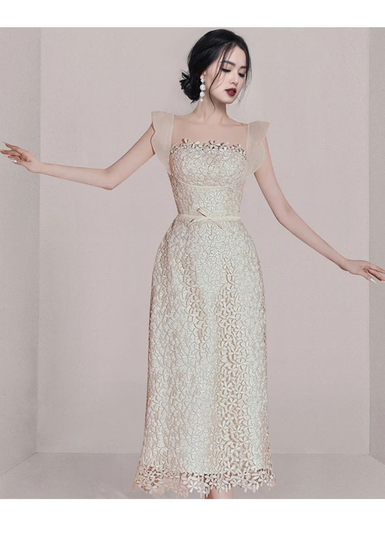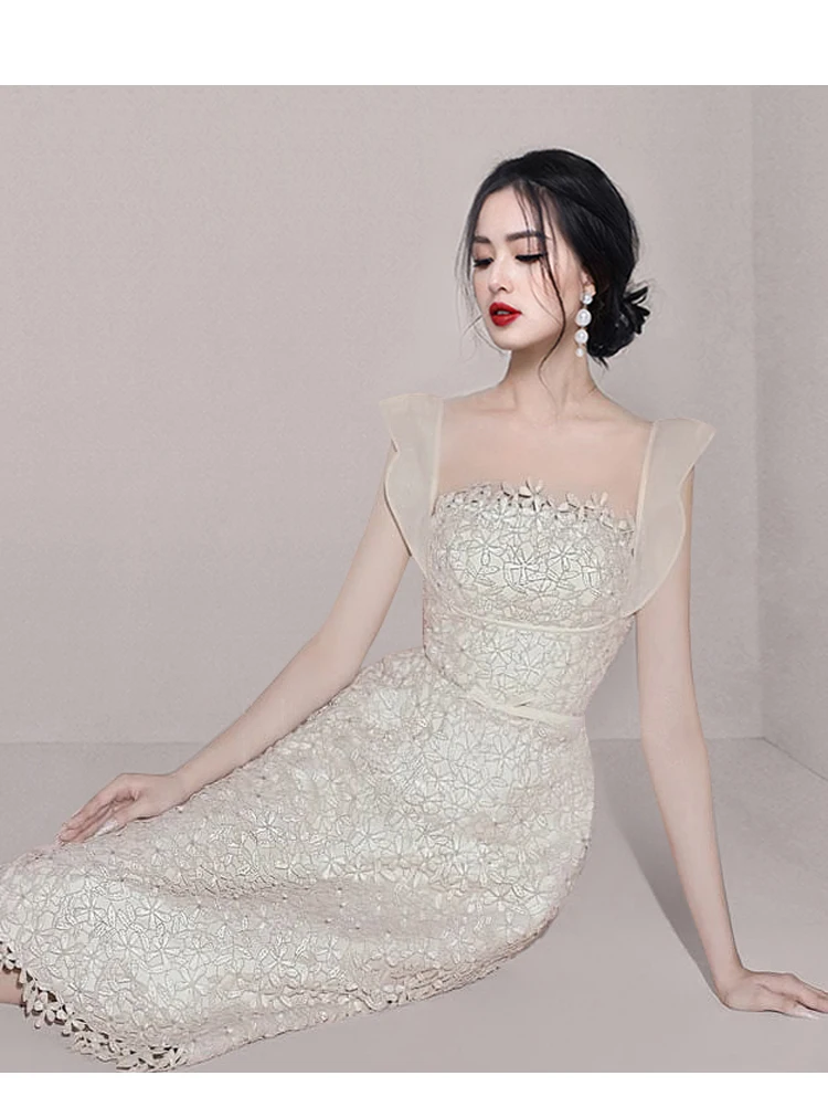 The off-shoulder lace detail adds a touch of sophistication and femininity to the dress.