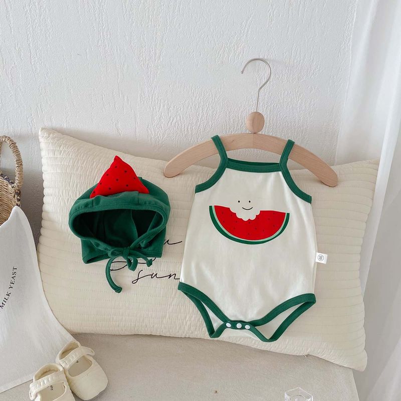 Summer baby cute watermelon style jumpsuit, male and female baby sling thin comfortable jumpsuit hat, suitable for going out