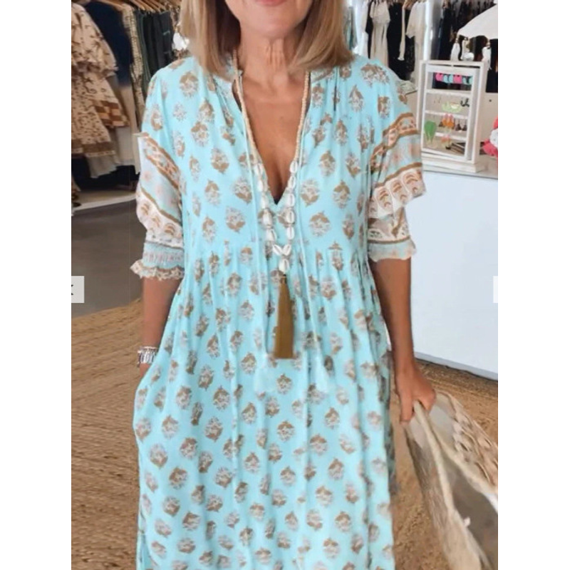 Summer Bohemian Print Lantern-Sleeved Dress Fashion Loose V-Neck Ruffle Long Dress Beach Clothing For Women Blue XXL