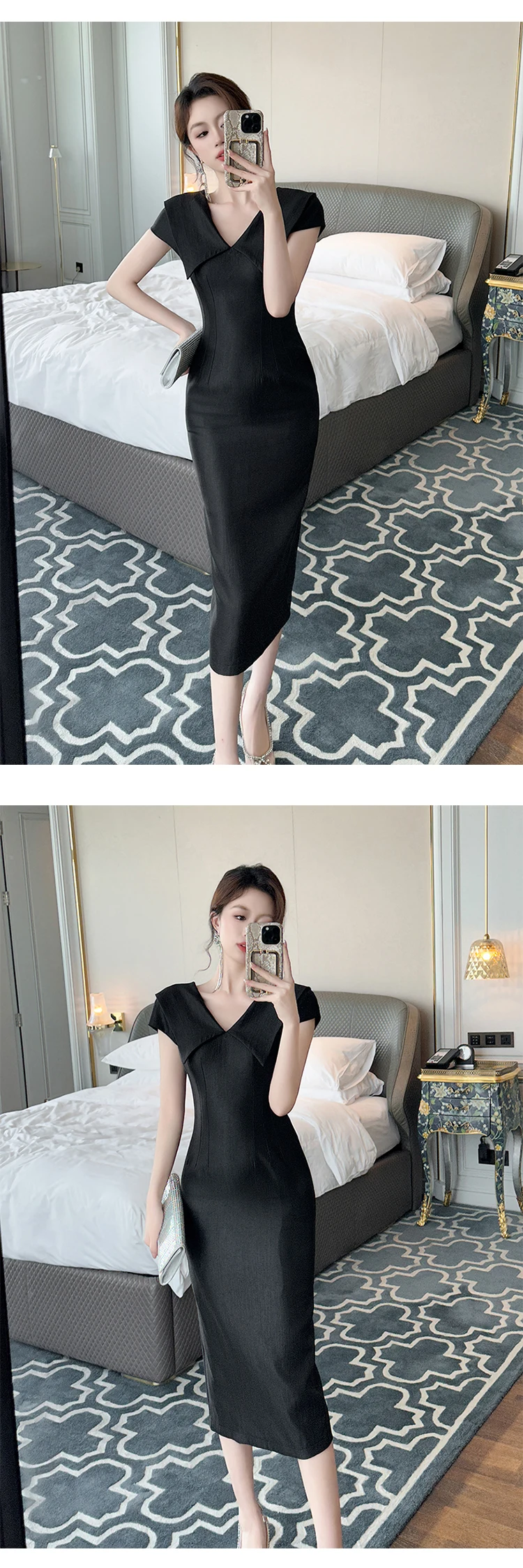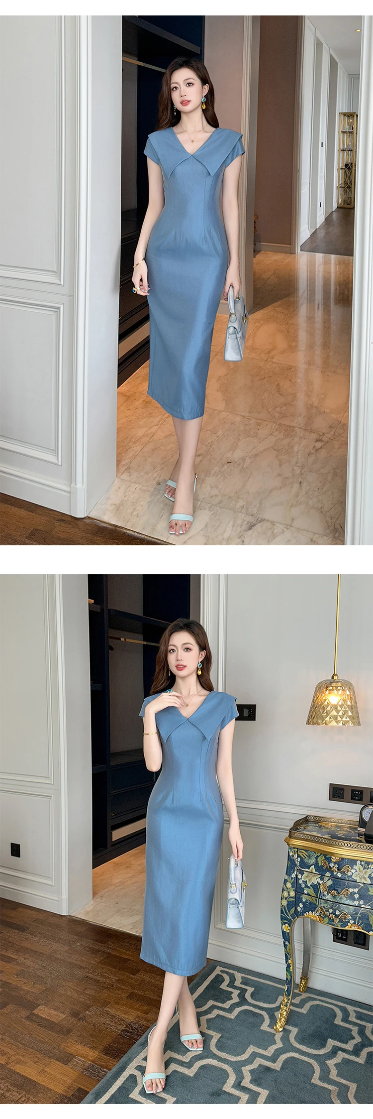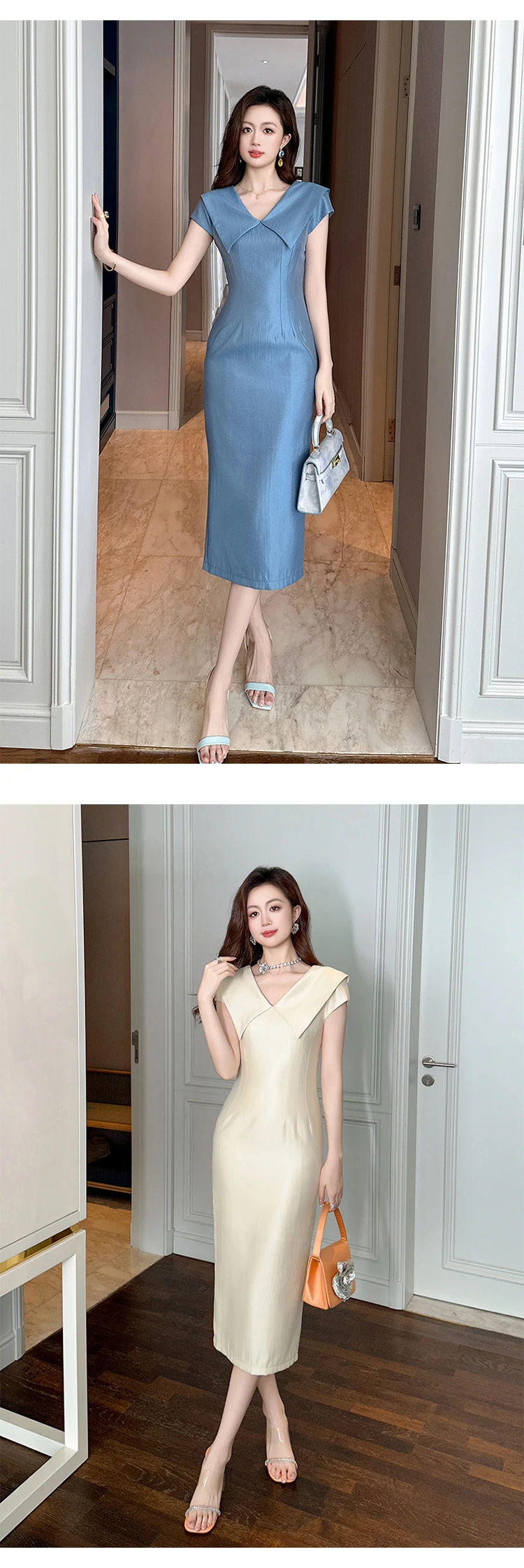 Summer Commute Formal Occasion Dress Women Clothes Elegant Lady Retro Solid Simple Lapel Short Sleeve Slim Midi Pencil Vestidos