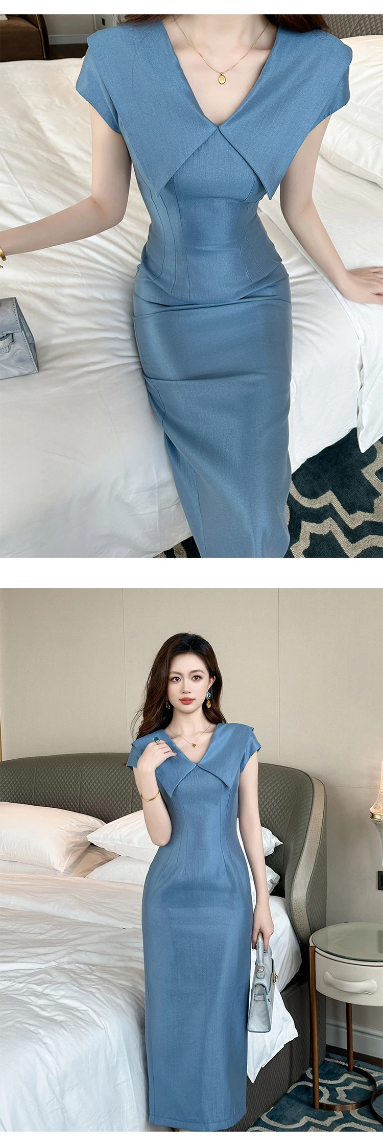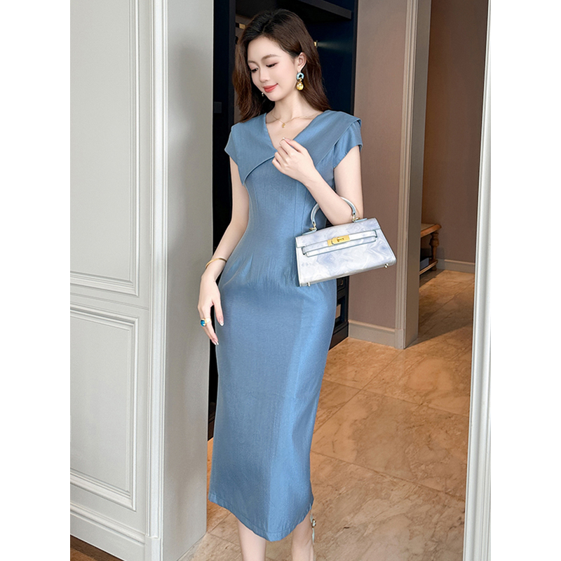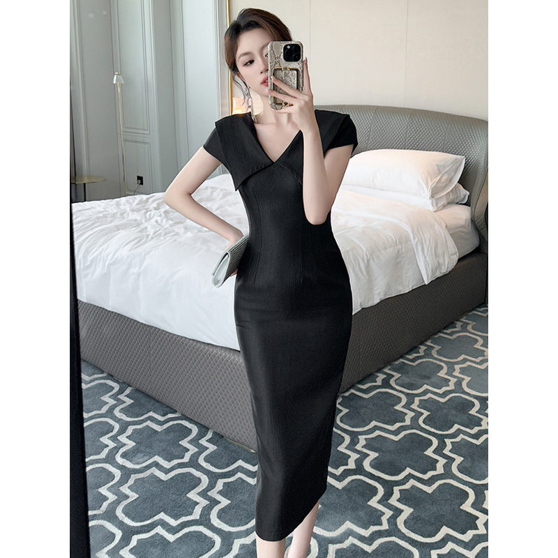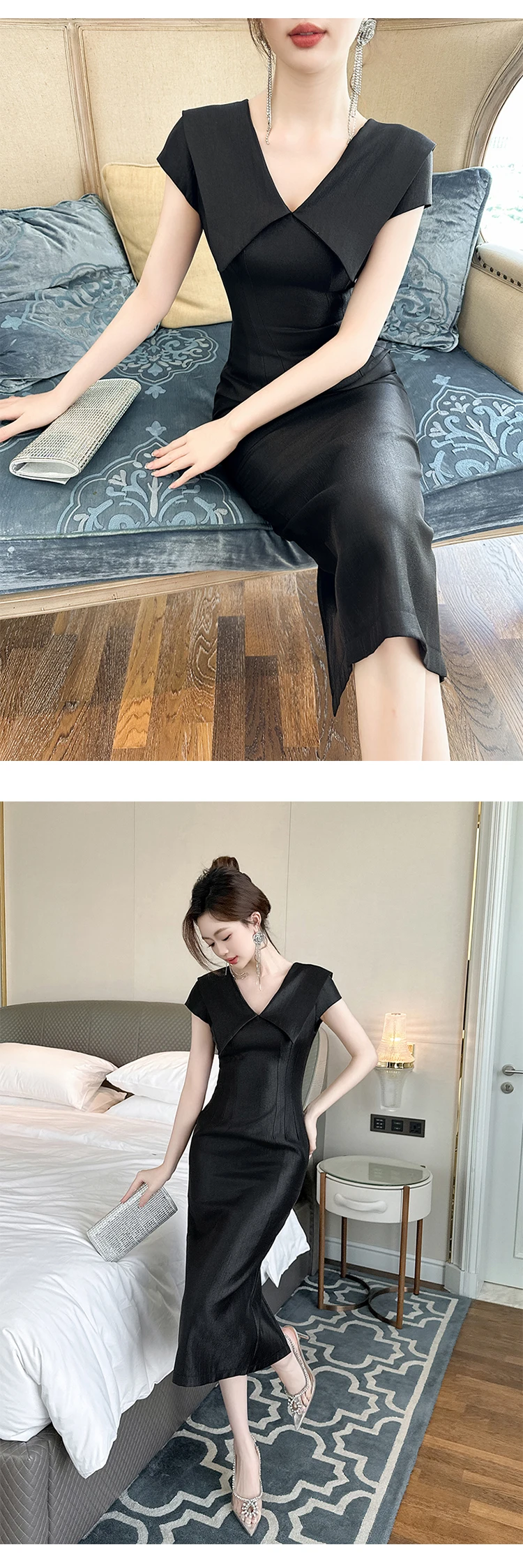 Summer Commute Formal Occasion Dress Women Clothes Elegant Lady Retro Solid Simple Lapel Short Sleeve Slim Midi Pencil Vestidos