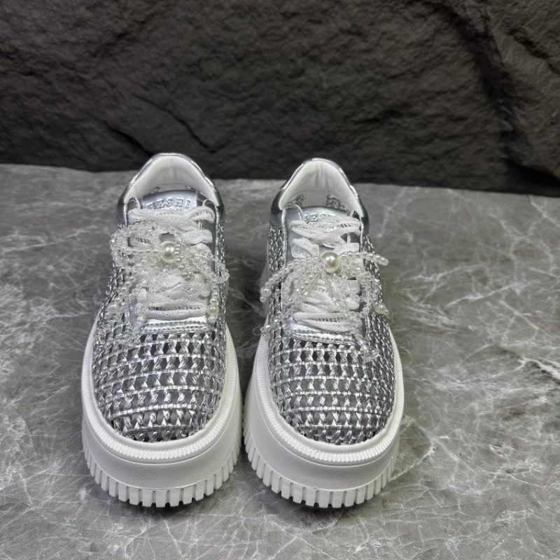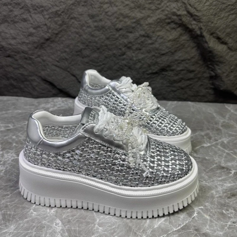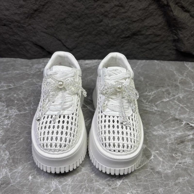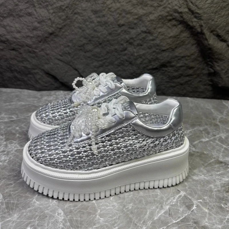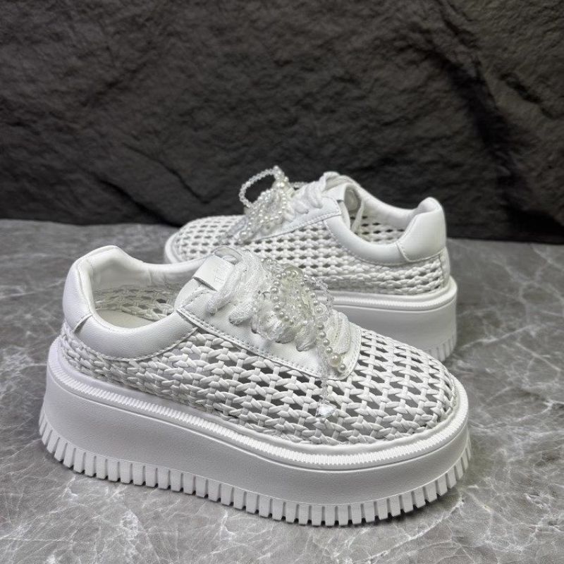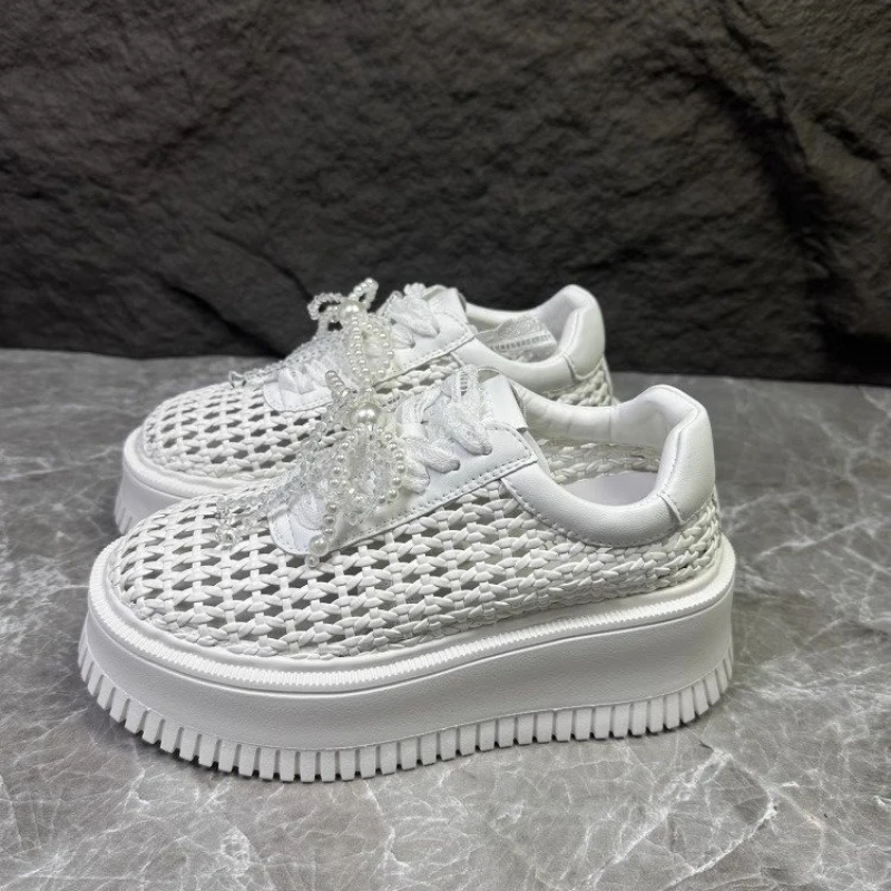 Summer Cutout Mesh Woven Shoes Woman Casual Sneakers Round Toe Breathable Mesh Lightweight Front Lace-Up Booster Platform Shoes