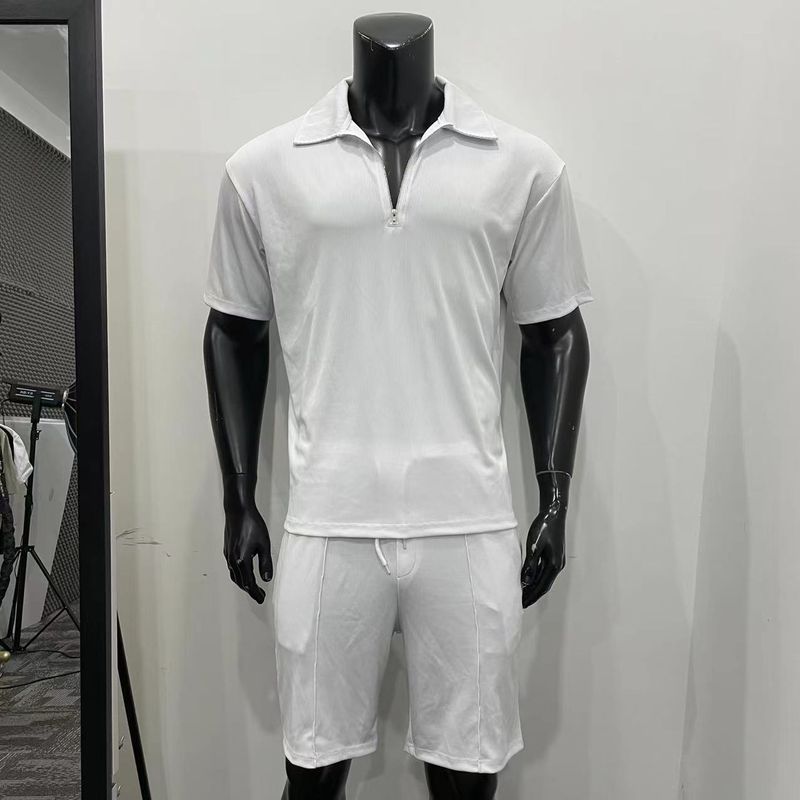 Summer Fashion Mens Clothing Men's Suits New Zipper Polo Casual Short Sleeve Drawstring Shorts Men's Set Sea Blue XL