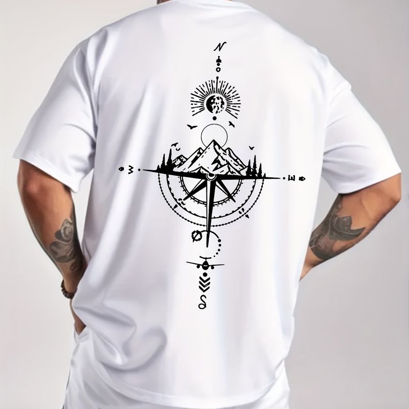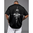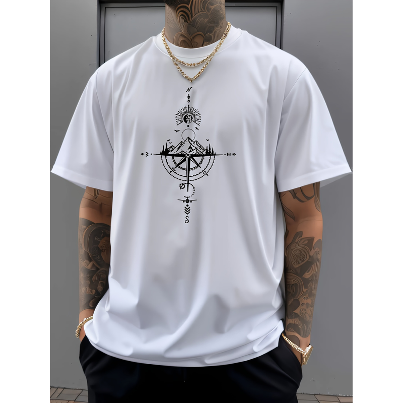 Summer men's 100% pure cotton casual sports loose oversized retro compass printed comfortable round neck short sleeved T-shirt
