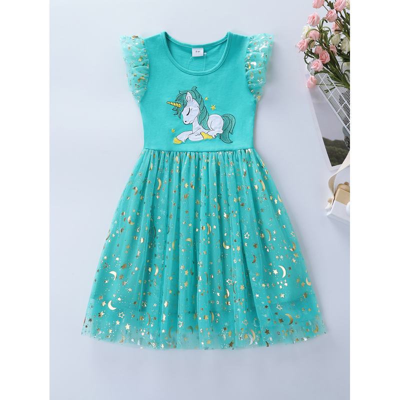 Summer New Girl's Cotton Unicorn Embroidered Mesh Spliced Sleeveless Dress SH1701
