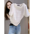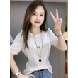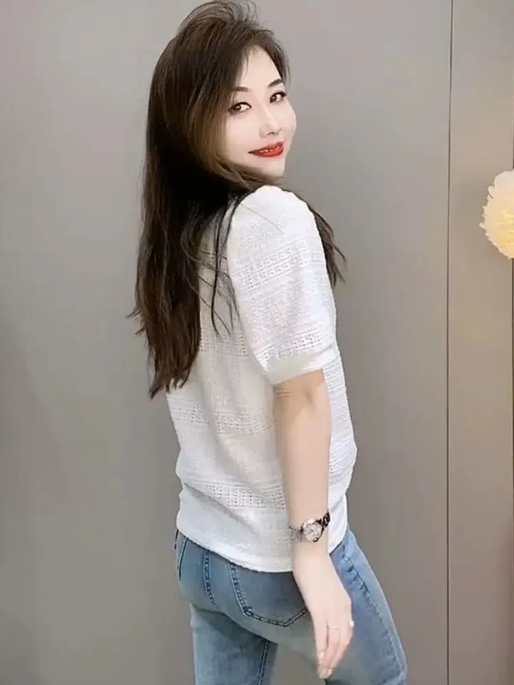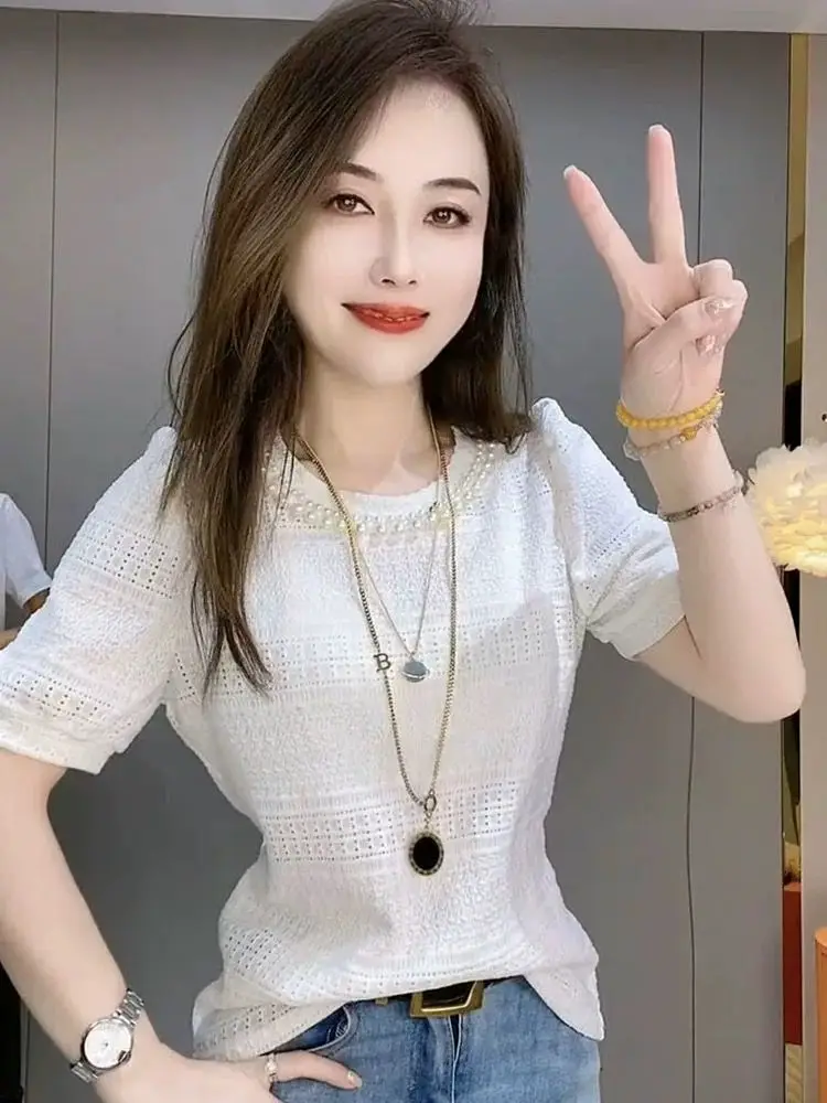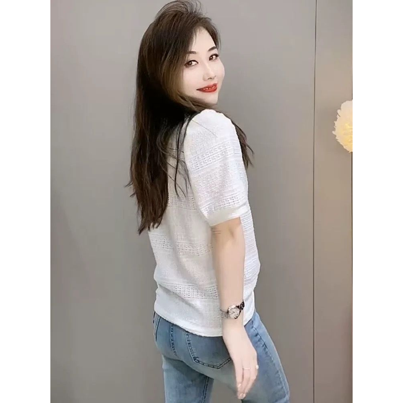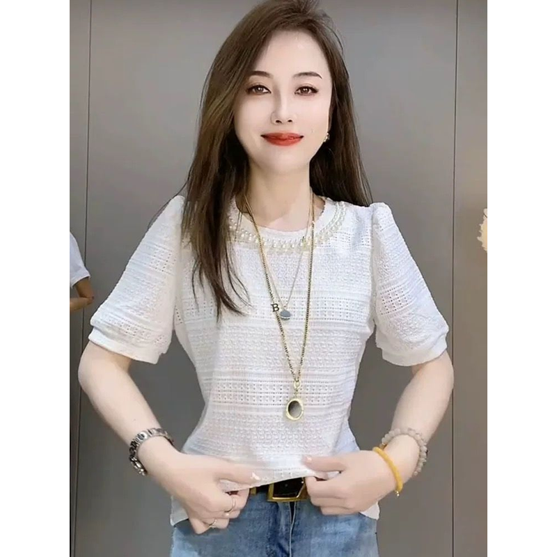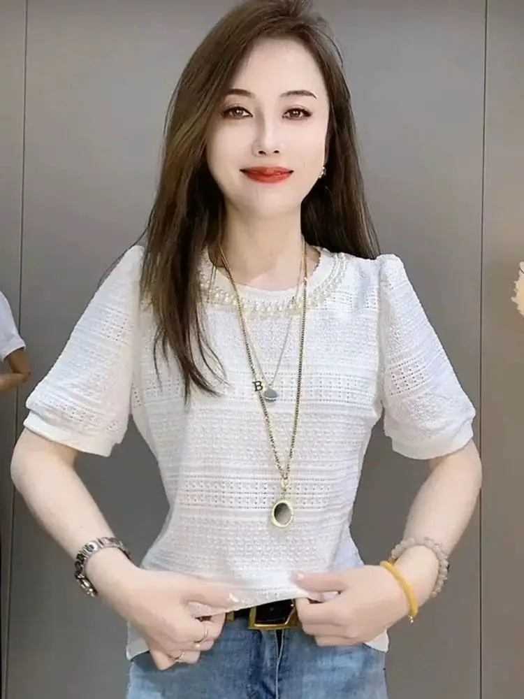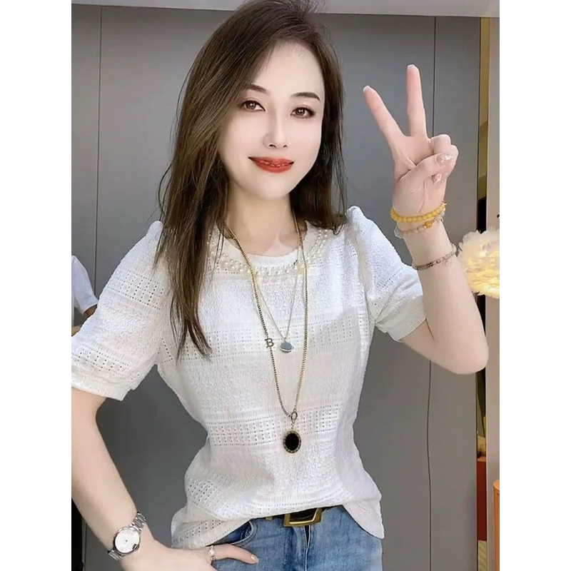 Summer New Solid Round Collar Beaded Lace Short Sleeve T-Shirt
