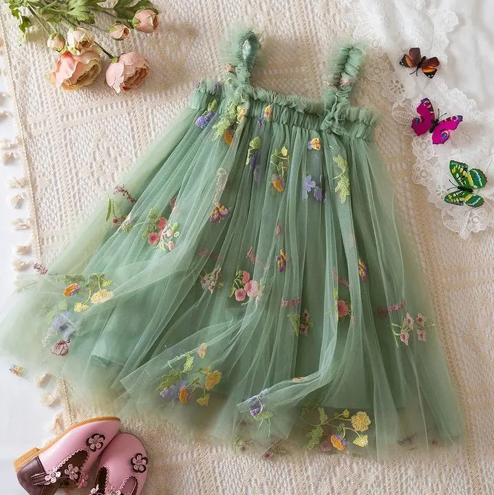 Summer New Sweet Girls' Little Sling Dress Children's Bow Floral Embroidery Mesh Tutu Princess Dress Baby Girl Dress