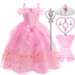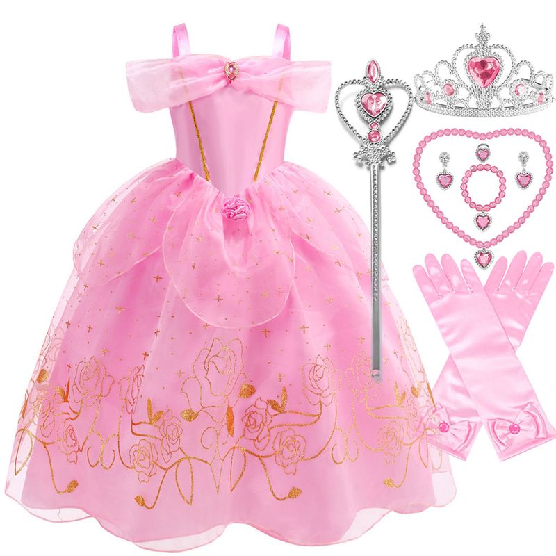 Summer Pink Aurora Princess Dress For Girl Cosplay Sleeping Beauty Cute Sling Sleeveless Costume Elegant Dress+ Accessories Set