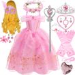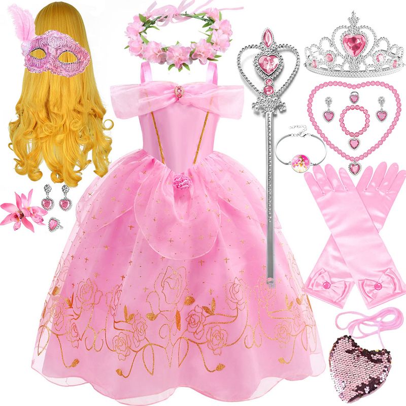 Summer Pink Aurora Princess Dress For Girl Cosplay Sleeping Beauty Cute Sling Sleeveless Costume Elegant Dress+ Accessories Set