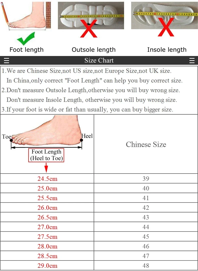 This is Chinese Size,the standard was based on "Foot Length",not "Shoes Length", not "Insole Length".