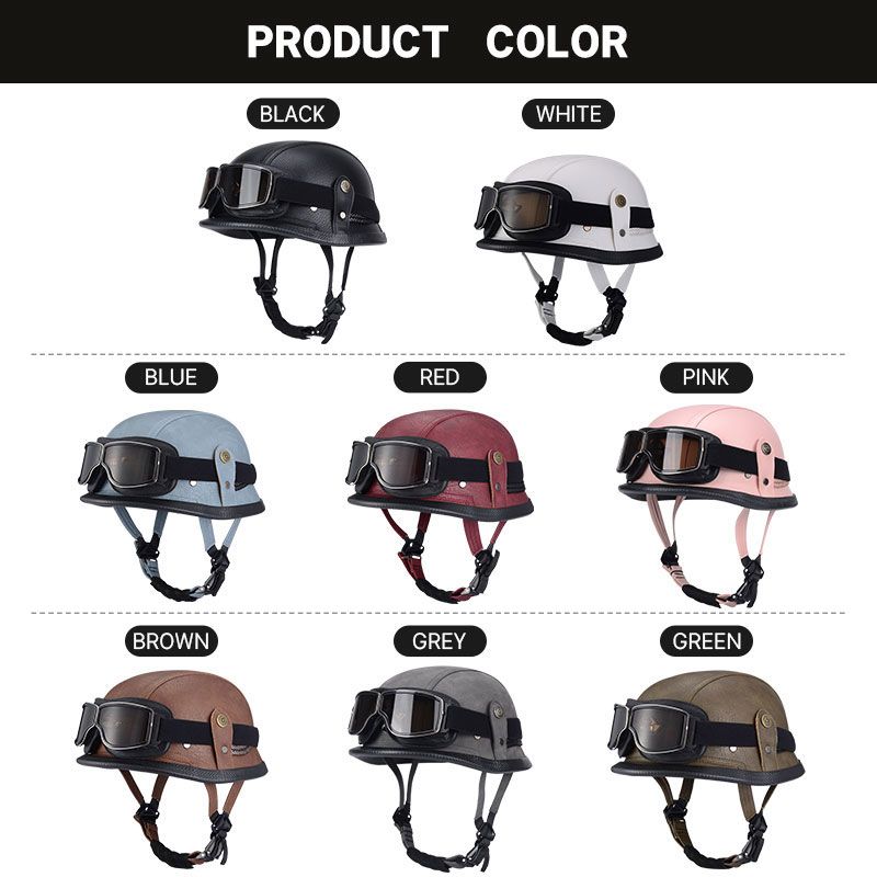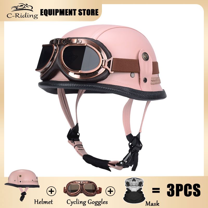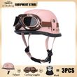 Summer Safety Helmet Women's Motorcycle Helmet Electric Motorcycle Vintage Half Helmet Pink Leather with Retro Googles