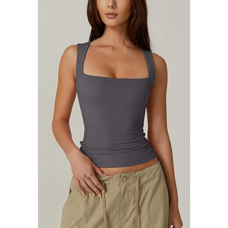 Summer Square-neck Tank Vest Ins Fashion Slim Solid Sleeveless Tops For Women Clothing Dark Gray S