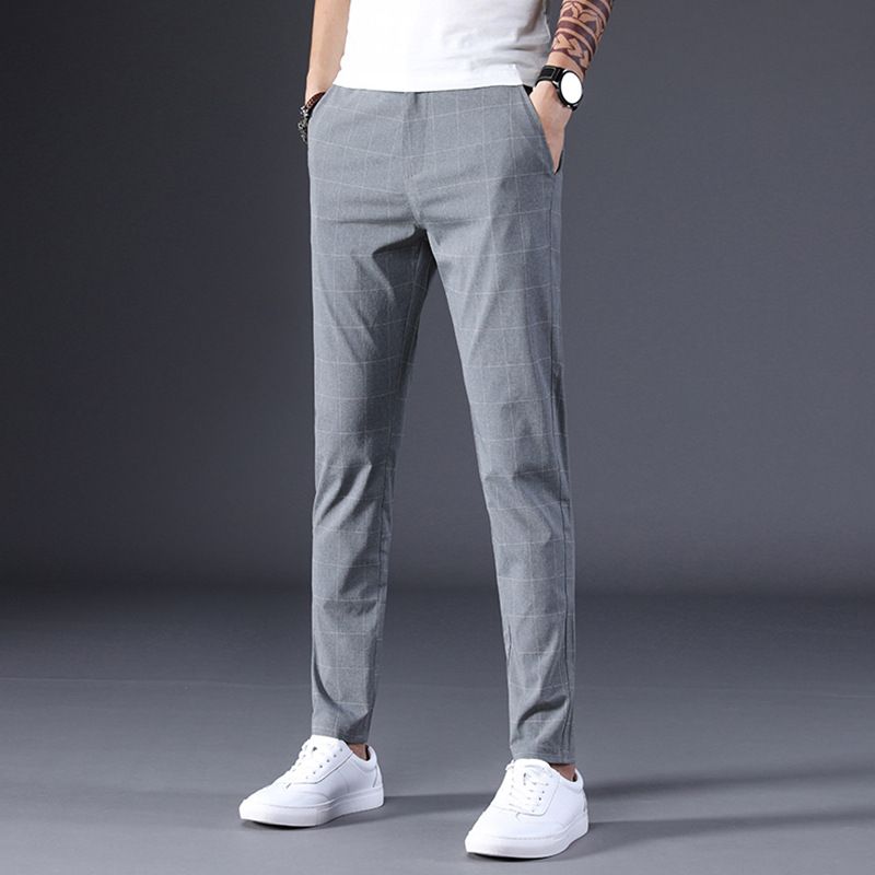 Summer Thin Plaid Stretch Straight-leg Youth Casual Trousers Grey 28