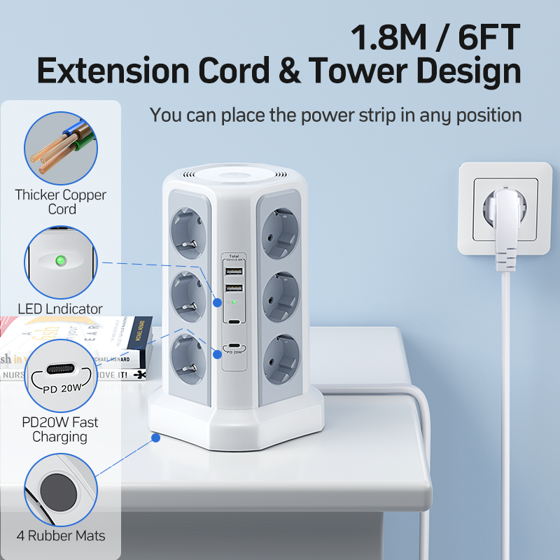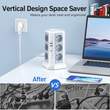 The power outlet features a space-saving tower design that uses vertical space to take up very little space, while providing 12 outlets and 4 USB ports.