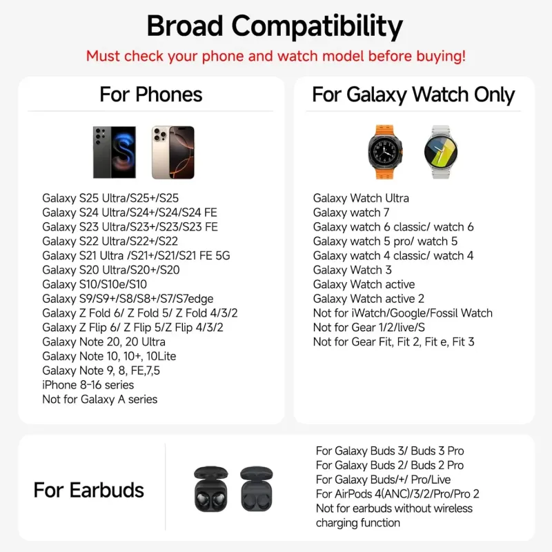 This product is compatible with Samsung devices that support wireless charging. If the device itself does not support wireless charging—such as Samsung A series—it will not work with this charger. However, in addition to Samsung, the charger may also be compatible with other devices that support wireless charging.