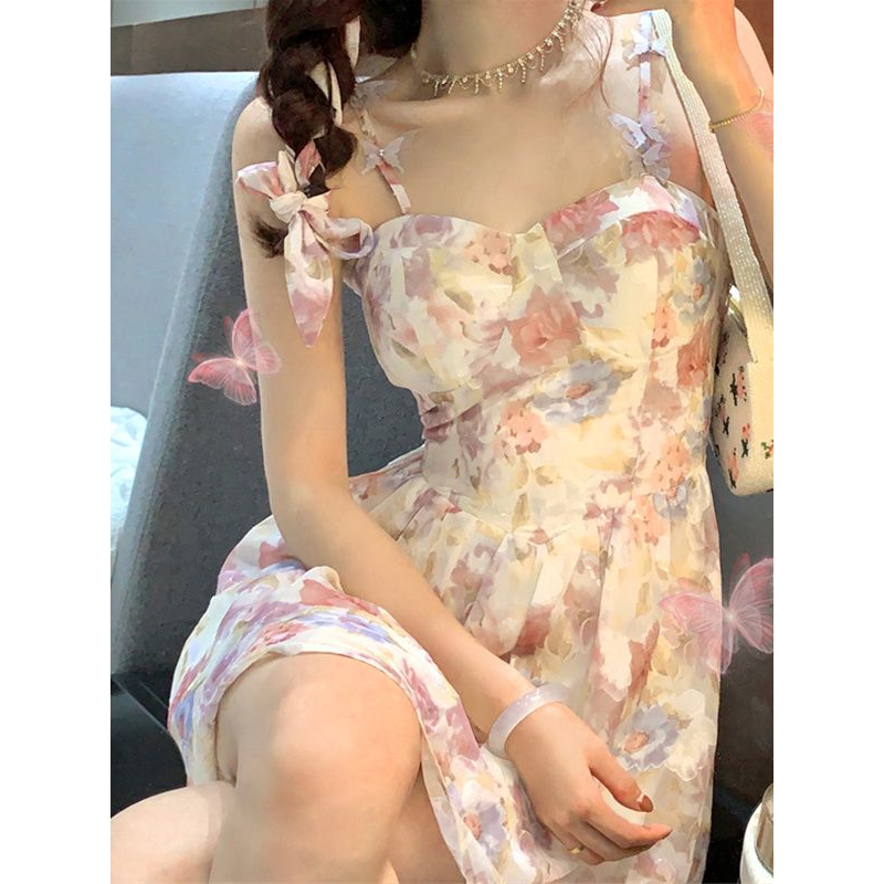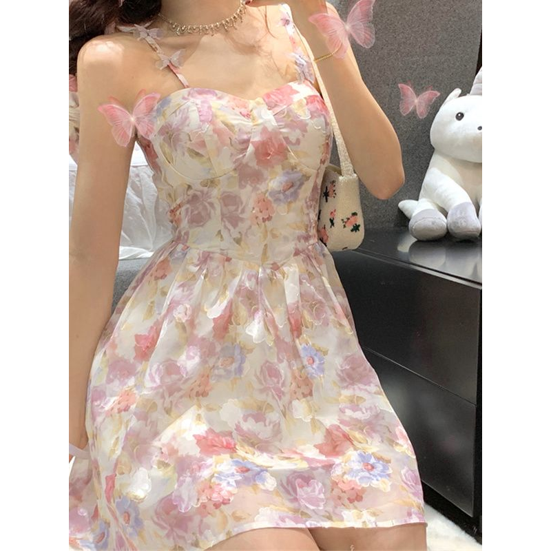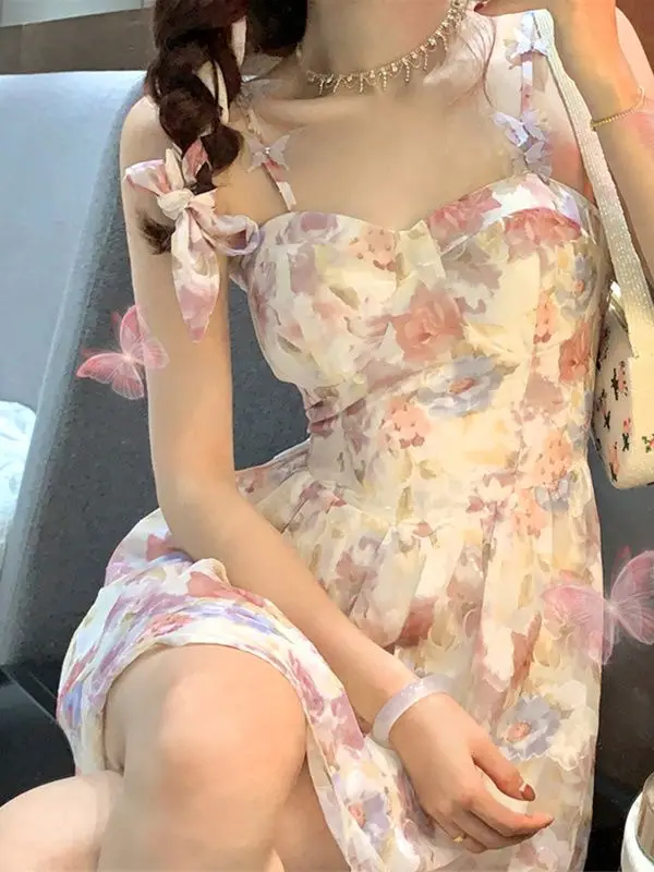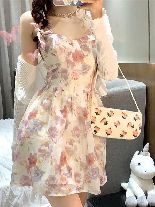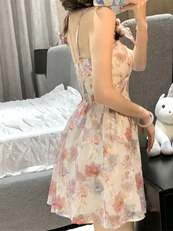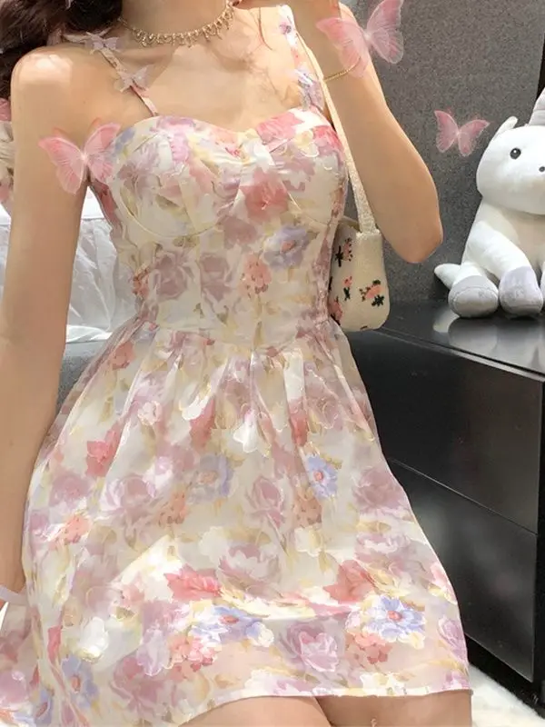Sweet Floral Print Spaghetti Strap Mini Dress Women Y2K Aesthetic Fairycore Chiffon Sundress Summer Beach Party Dress 2026 New