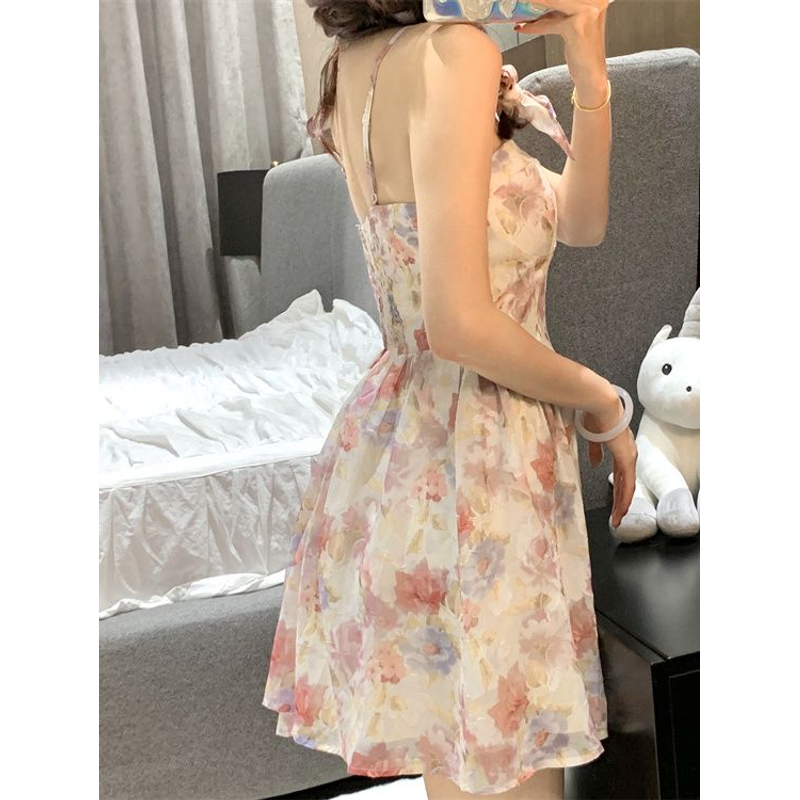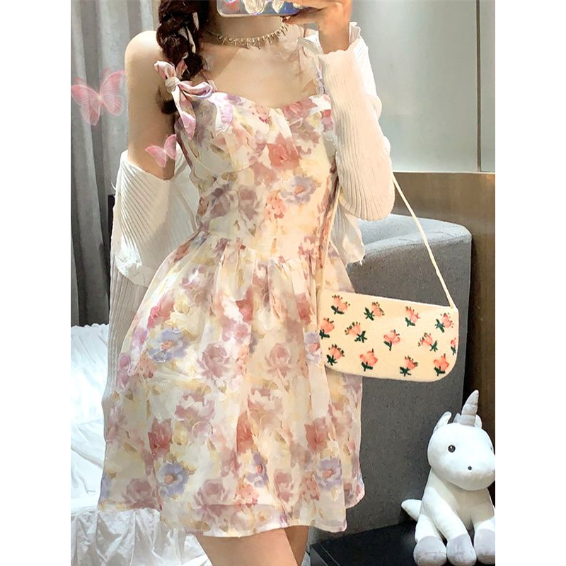 Sweet Floral Print Spaghetti Strap Mini Dress Women Y2K Aesthetic Fairycore Chiffon Sundress Summer Beach Party Dress 2026 New