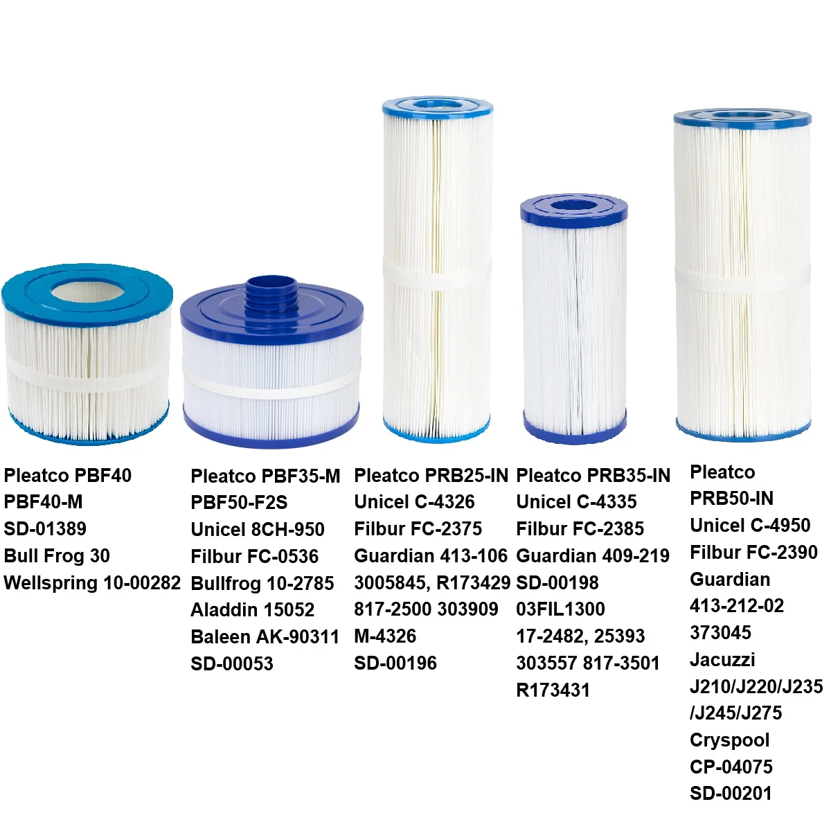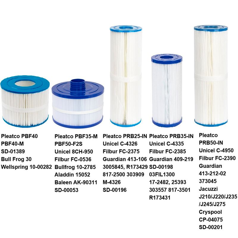 J:  PBF35-M Spa Filter Cartridge For Bullfrog 10-2785, Pleatco PBF35-M, PBF50-F2S, Unicel 8CH-950, Filbur FC-0536, Excel Filters XLS-834, Aladdin 15052, Baleen AK-90311, SD-00053.