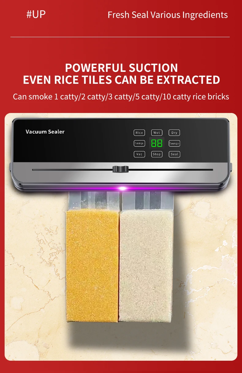 Our food sealer machine is a versatile tool for all your food preservation needs. From dry/moist dual mode to rice brick mode, external VAC mode, and sealed mode, we've got you covered. Plus, with a strong 65Kpa suction, it guarantees a secure seal every time.