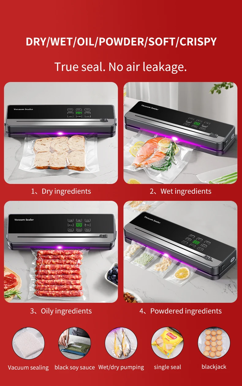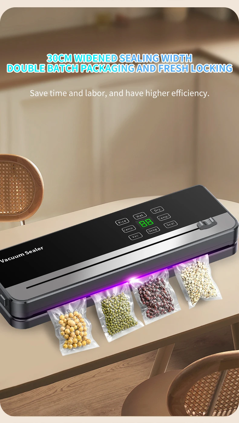 Experience the power of our food vacuum sealer, equipped with a purple light sterilization system for top-notch food safety. Its extended wide sealing design ensures a tight seal, keeping your food fresh and reducing waste.