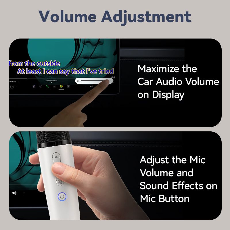 Answer: First, set the master volume (Master Volume= Music volume via the MIC ICON) to a higher level in your car. For the convenience of handheld operation, adjust the mic volume and sound reverb effects only using the buttons on the microphone.The MIC ICON slider does not control these functions—we have simplified the operation to only use the mic buttons for ease of use!Within the Music/Karaoke app, you can separately adjust the music volume to be lower or higher.