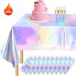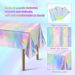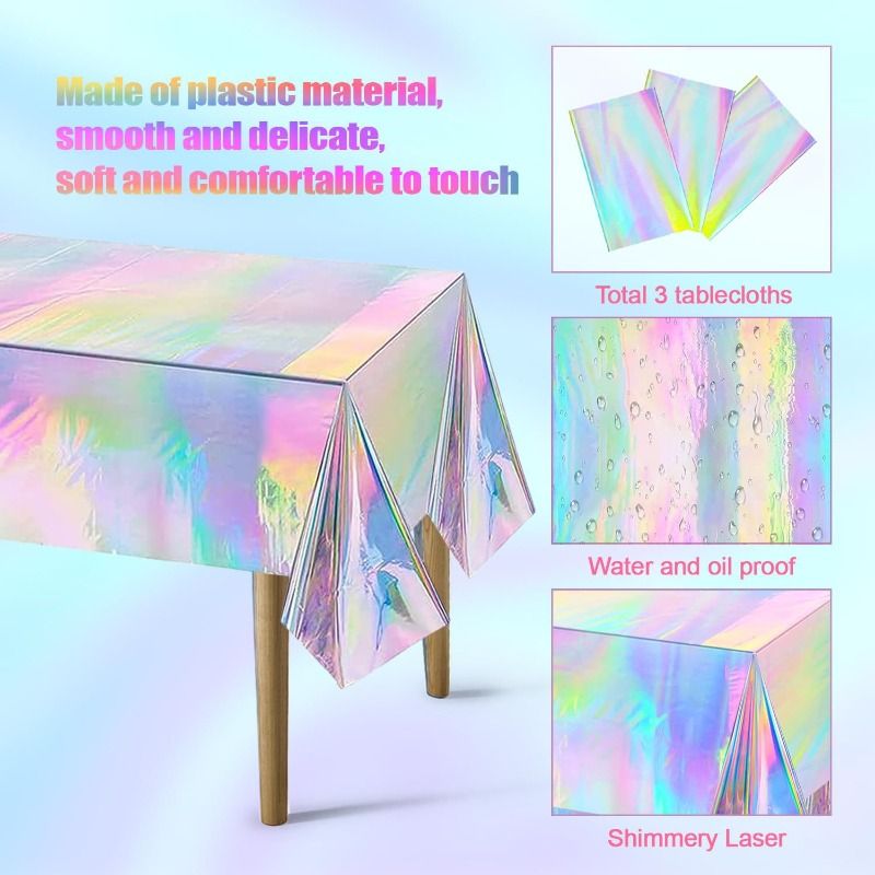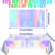 Package Include: 1 piece of iridescent holographic plastic tablecloth, measuring 54×108 inches (137×274 cm), fits all rectangular tables up to 8ft for party decor.